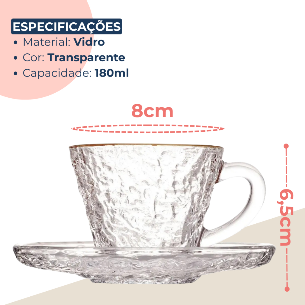 Jogo 4 Xícaras Para Café Chá 180ml com Pires Em Vidro Martelado Borda Dourada