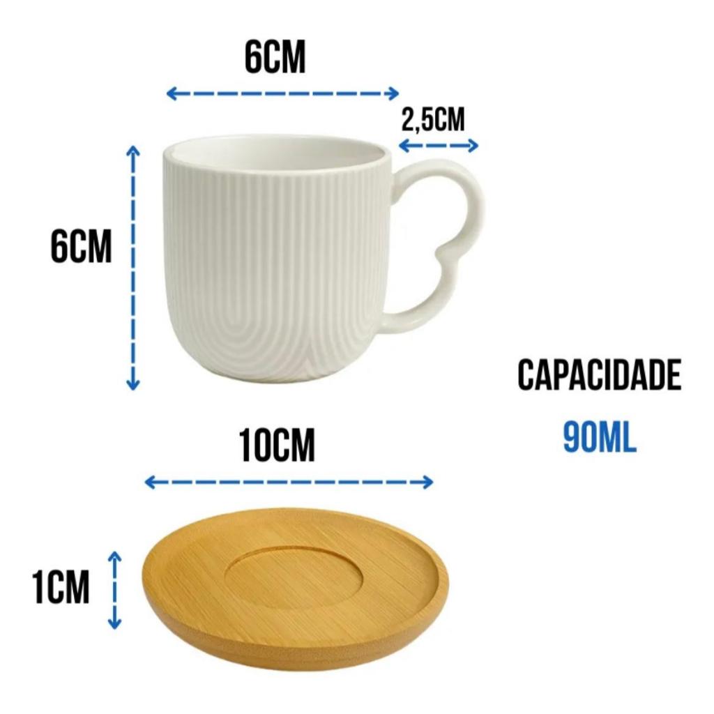 Jogo 4 Xícaras Café Chá Cerâmica Branca C/pires Bambu 90ml Este Jogo 4 Xícaras Café Chá Cerâmica Branca C/Pires Bambu 90ml combina beleza e conforto em um design sofisticado. Feita de cerâmica de alta qualidade, mantém a temperatura da sua bebida por mais tempo, ideal para momentos tranquilos ou dias corridos. A sua alça foi cuidadosamente desenhada para ter um encaixe perfeito nos dedos, garantindo conforto ao segurar. Seu acabamento elegante não só complementa qualquer ambiente, mas também eleva sua experiência de tomar café ou chá a um novo nível de prazer e estilo. Acompanhando também o pires feito de bambu, para garantir segurança para sua xícara e ainda sim manter um design natural e elegante para poder deixá-la em qualquer mesa sem ter perigo de danificá-la Perigos: Cuidados durante o manuseio do produto para evitar acidentes. Evite quedas e pancadas para não danificar o produto. No caso de quebra, cuidado ao manusear, pois poderá produzir cacos cortantes e perfurantes. Cuidados: Lave o produto somente com sabão neutro e esponja macia. Mantenha o produto sempre limpo para o próximo uso. Não limpe as peças com esponjas ásperas, palha de aço ou produtos abrasivos. Para secar, utilize um pano seco e macio. Ficha Técnica Material: Cerâmica e Bambu Cor: Branco ou Preto Dimensões: Xícara 8,5 x 6,5 x 6cm / Pires 10 x 10cm Conteúdo: 04 Jogo 4 Xícaras Café Chá Cerâmica 90ml 04 Pires