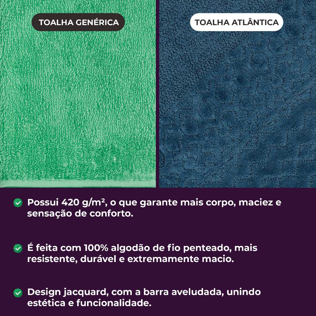 Jogo 4pç Toalha Banho Algodão Fio Penteado Barrado Aveludo – 420 g/m² – 70cmx130m – Fio Penteado As Toalhas de Banho Atlântica Loft é a escolha ideal para quem busca conforto, maciez e alta qualidade no dia a dia. Produzida em 100% algodão e com fio penteado, ela oferece toque extremamente suave, excelente absorção e durabilidade superior. Com gramatura de 420 g/m², é leve na medida certa e eficiente na secagem. Seu tamanho de 70cmx130m banho e a de rosto 50cm x 70cm é perfeito para envolver o corpo com conforto, sendo ideal para uso em casa, academias, viagens e montagem de enxoval. O tecido felpudo e uniforme garante uma sensação agradável na pele, evitando o ressecamento e tornando o pós-banho muito mais relaxante. A Linha Loft foi desenvolvida com acabamento de alta qualidade e costuras reforçadas, garantindo maior vida útil mesmo após diversas lavagens. Além disso, o design moderno e versátil combina com qualquer estilo de banheiro, sendo também uma ótima opção para presentear. ITENS INCLUSOS: 2 Toalha de Banho 70cmx130m 2 Toalha de rosto 50cm x 70cm FAQ – Perguntas Frequentes 1) A toalha é realmente 100% algodão? Sim! A Toalha Atlântica Loft é feita inteiramente de algodão puro, garantindo maciez, conforto e excelente absorção. 2) O material é felpudo? É macia ao toque? Sim. Ela possui corpo felpudo e fios penteados, proporcionando toque suave, textura aconchegante e sensação agradável na pele. 3) Posso usar amaciante? Recomenda-se lavá-la separadamente nas primeiras utilizações, evitar o uso excessivo de amaciantes e optar por secagem natural ou em baixa temperatura. 4) A cor desbota com o tempo? A Atlântica utiliza corantes de alta qualidade, e as costuras reforçadas garantem durabilidade. Seguindo os cuidados de lavagem, a toalha mantém cor e maciez por muito mais tempo.