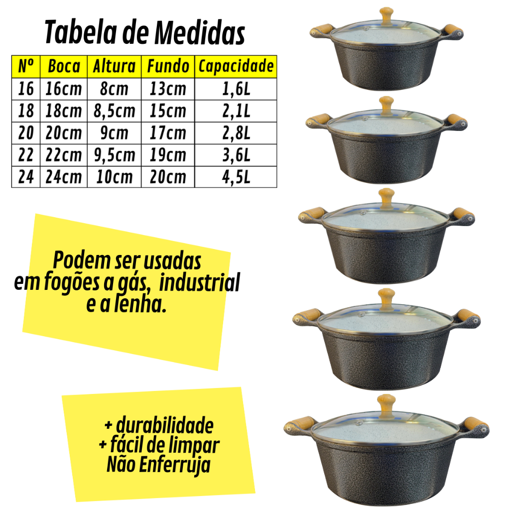 Conjunto de Panelas em Alumínio Fundido e Usinado com revestimento Antiaderente em Cerâmica, Cabo de Madeira e Tampas em Vidro Temperado. Cores Disponíveis: PRETA VERMELHA CARACTERÍSTICAS; * Tipo: Panela Antiaderente * Material: Alumínio Fundido e Usinado * Material do Cabo: Madeira Tratada * Acompanha Tampa: Sim * Material da Tampa: Vidro Temperado * Super Resistentes * Não Enferruja * Não Gruda + Bonita + Duravél + Fácil de Limpar MEDIDAS APROXIMADAS: N16 Diâmetro: 16cm Comprimento:22cm Altura: 8cm Fundo: 13cm Capacidade: 1,6L N18 Diâmetro: 18cm Comprimento:25cm Altura: 8,5cm Fundo: 15cm Capacidade: 2,1L N20 Diâmetro: 20cm Comprimento:27,5cm Altura: 9cm Fundo: 17cm Capacidade: 2,8L N22 Diâmetro: 22cm Comprimento:30cm Altura: 9,5cm Fundo: 19cm Capacidade: 3,6L N24 Diâmetro: 24cm Comprimento:33cm Altura: 10cm Fundo: 20 Capacidade: 4,5L Produto pode ser usado: • Uso industrial, hotéis, restaurantes, escolas e no seu lar. • Fogões a lenha, Fogões a gás, Fogões industriais. SOBRE A EMPRESA: Está no mercado desde 2017, nossos produtos são rigorosamente vistoriados por profissionais altamente qualificados para certificar que você receberá em seu lar somente produtos com altíssima qualidade. SELO CERTIFICADO DO INMETRO GARANTIA DE FÁBRICA A DK Shopp traz para você e seu lar, praticidade e muita qualidade em produtos em alumínio.