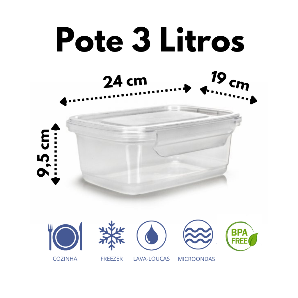 Jogo 5 Potes RETANGULAR 3 Litros Tampa Trava Marmita Transparente Reutilizável Alimentos BPA FREE