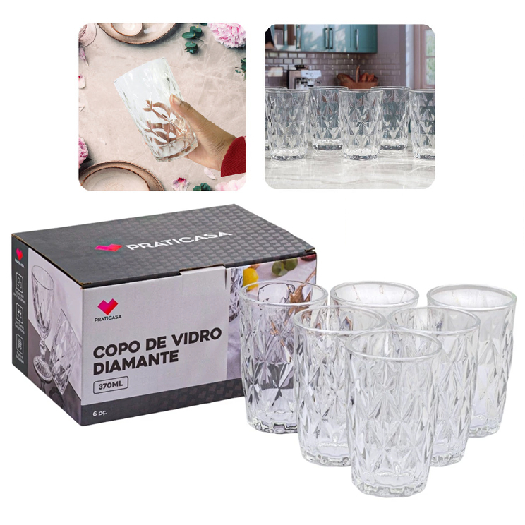 | Jogo 6 copos de vidro Diamante 370ml ou 270ml este produto | R$ 29,99 | — | 4.9/5 | 9 |