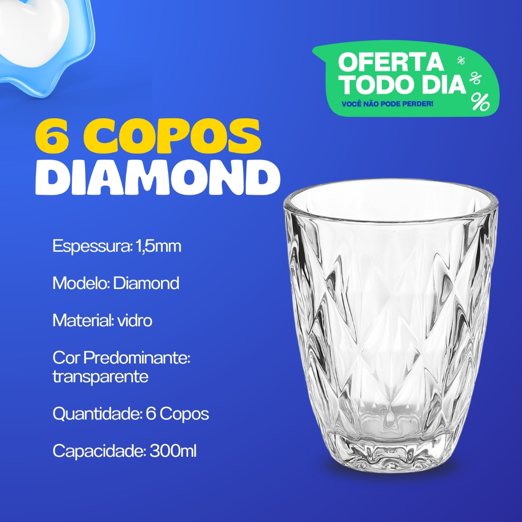 | Jogo 6 Copos Diamond 300ml Vidro Grosso Diamante Luxo este produto | R$ 29,45 | 41% | 4.8/5 | 38 |