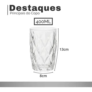 Jogo 6 Copos Vidro Diamond 400ml Diamante Alto Grosso Resistente Para Suco Água e Refrigerante