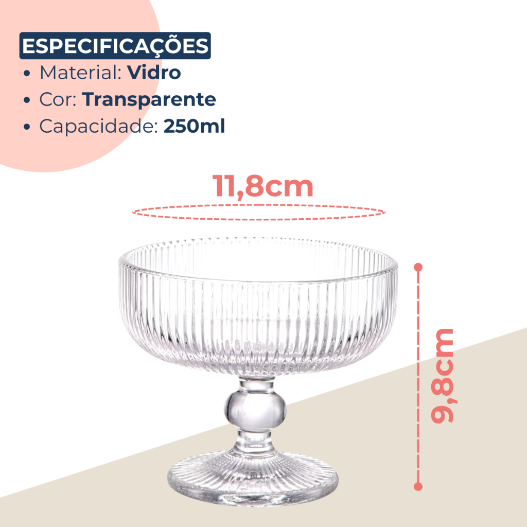 Jogo 6 Taça Sobremesa Vidro Sorvete Açai 250ml Canelado Luxo