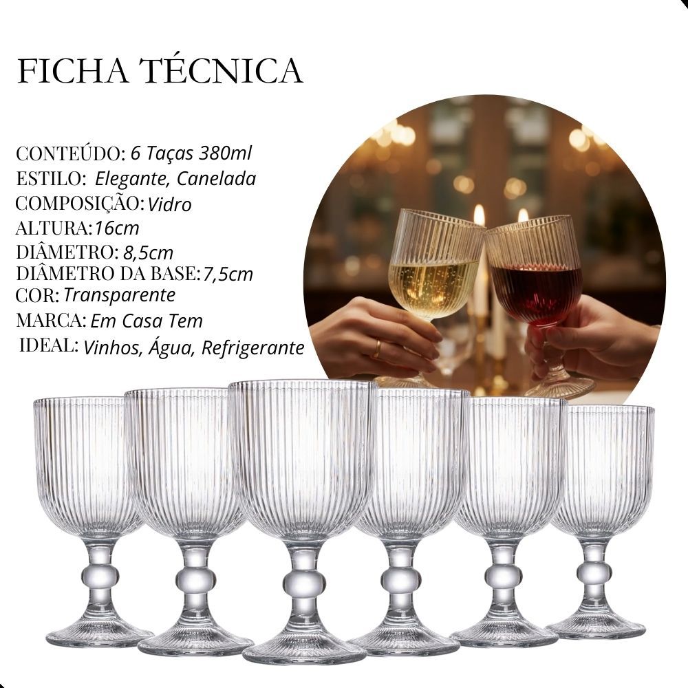 Jogo 6 Taças 380ml Kit Vidro Premium Para Vinho, Drinks e Mesa Posta Sofisticada Luxo Transforme sua mesa com o conjunto de Taças Canelada, que une elegância, resistência e versatilidade em cada detalhe. Produzidas em vidro de alta qualidade e com design sofisticado, são ideais para servir vinho, água, sucos, refrigerantes, coquetéis e outras bebidas, tornando cada brinde especial. Seja no dia a dia, em jantares, encontros com amigos ou datas comemorativas, essas taças elevam a experiência e a apresentação da sua mesa. Além de funcionais, são perfeitas como presente elegante e útil para casamentos, aniversários, chá de casa nova e outras ocasiões especiais. Garanta agora o seu kit de taças e surpreenda em sua próxima reunião ou celebração. RECOMENDAÇÕES DE USO E OCASIÕES: Para servir vinho, água, sucos, refrigerantes, coquetéis e bebidas diversas; Ideal para o dia a dia, refeições em família, eventos, jantares, encontros entre amigos, datas comemorativas e mesa posta; Ótima sugestão de presente funcional e elegante para casamentos, aniversários, chá de casa nova e outras ocasiões especiais. CUIDADOS COM O PRODUTO: Lavar com detergente neutro e esponja macia (lado amarelo); Para limpeza profunda, deixar de molho com água morna e detergente neutro; Não utilizar palha de aço ou produtos abrasivos; Evitar impacto com objetos duros ou pontiagudos que possam causar trincas; Manter fora do alcance de crianças; Não recomendado para forno, micro-ondas ou freezer. INFORMAÇÕES TÉCNICAS: Kit contém: Taças de vidro Volume: 380ml Peso aproximado (por taça): 370g Dimensões aproximado (por taça): Altura: 16cm Diâmetro da boca: 8,5cm Diâmetro da base: 7cm Espessura do vidro: 3mm Composição: 100% vidro Validade: Indeterminada Marca: Em Casa Tem Imagem Meramente Ilustrativas