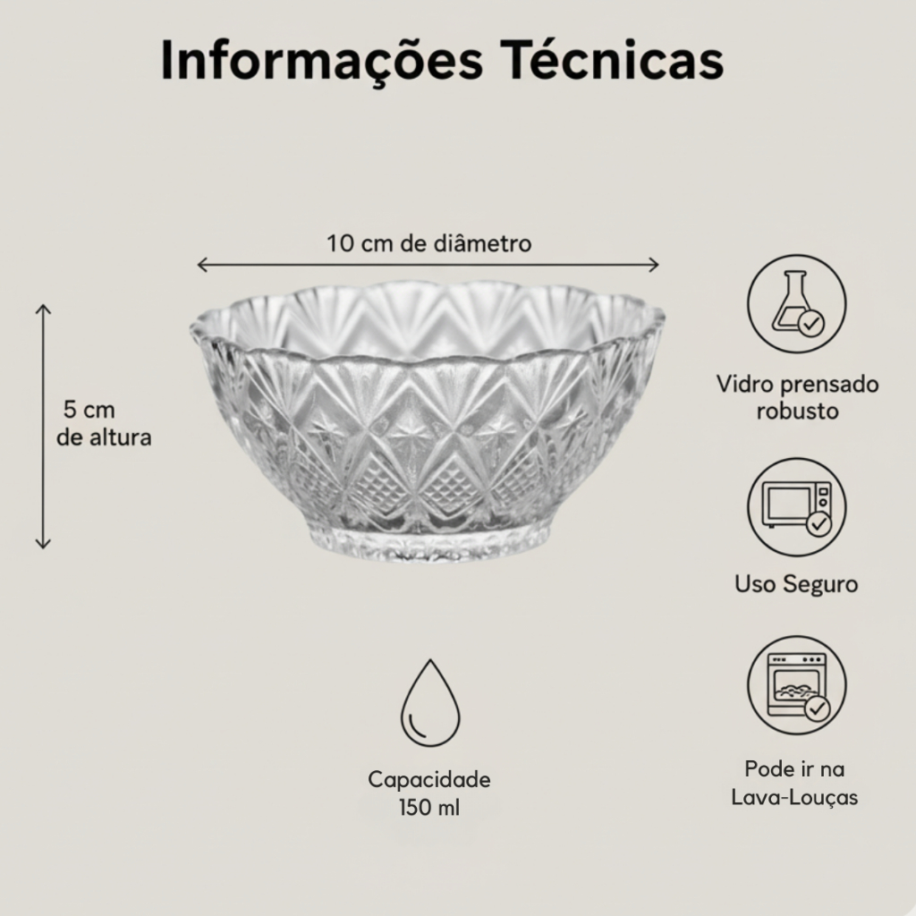 ***ATENÇÃO: CARO CLIENTE, PEDIMOS A GENTILEZA DE LER A DESCRIÇÃO SOBRE AS MEDIDAS. CASO AINDA RESTAR DÚVIDAS, NOS ENVIE UM CHAT ANTES DE EFETUAR A COMPRA! CORDIALMENTE.*** REALCE A SOBREMESA. ENCANTE SEUS CONVIDADOS. Transforme cada doce em uma experiência memorável. O jogo de taças bowls de vidro com 6 peças traz elegância, brilho e sofisticação para sua mesa — seja no almoço em família, um jantar especial ou até na decoração do dia a dia. Feitas com vidro resistente e acabamento lapidado, as taças possuem relevo decorativo que valoriza a apresentação de cada receita. ________________________________________ POR QUE ESCOLHER O CONJUNTO DE TAÇAS BOLWS? ✔ Versátil para qualquer ocasião: sobremesas, entradas, saladas de fruta, petiscos e até decorações com velas ou flores. ✔ Design premium: relevo facetado em estilo cristal que impressiona à primeira vista. ✔ Material resistente: vidro grosso e durável, com acabamento refinado. ✔ Compacta e funcional: cada taça possui 10cm de diâmetro, perfeita para porções individuais. ✔ 6 unidades por kit: ideal para receber amigos e familiares com elegância. ________________________________________ ESPECIFICAÇÕES TÉCNICAS • Modelo: Trell • Marca: Casart • Cor: Transparente • Material: Vidro prensado • Diâmetro: 10cm • Altura: 5cm • Volume: 150ml • Peso total: 640g • Quantidade: 6 taças ________________________________________ ELEGÂNCIA, PRATICIDADE E ECONOMIA EM UM SÓ KIT. Adicione um toque de charme à sua rotina com taças que unem beleza, funcionalidade e custo-benefício. Ideal para quem valoriza bom gosto sem abrir mão da praticidade no dia a dia. ________________________________________ 🟩 PERGUNTAS FREQUENTES (FAQ) 1. As taças podem ir à lava-louças? Sim! O vidro é resistente e compatível com lava-louças, facilitando a limpeza sem riscos. 2. São adequadas para micro-ondas ou forno? Não. Por segurança, não é recomendado o uso em micro-ondas, forno ou sobre chamas. 3. Cada taça serve qual volume de alimento? Serve 150ml, ideal para sobremesas individuais, como mousse, pudim, salada de frutas e sorvete. 4. O vidro é grosso ou frágil? É um vidro prensado de espessura média, com boa resistência para o uso cotidiano. 5. O relevo das taças interfere na limpeza? Não. Mesmo com o relevo decorativo, a limpeza é fácil — tanto à mão quanto na lava-louças.