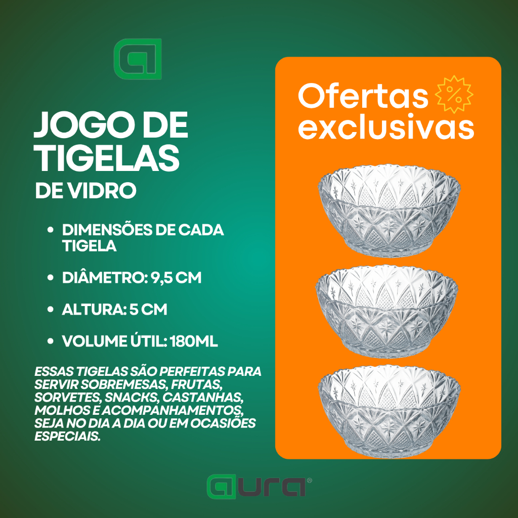 Descrição do Produto – Kit com 6 Tigelas de Vidro 180ml Talberg VL0824 O Kit com 6 Tigelas de Vidro 180ml da Talberg (Ref. VL0824) é a escolha ideal para quem valoriza elegância, praticidade e versatilidade na hora de servir. Com design clássico e acabamento lapidado, cada peça possui um charme atemporal que remete ao brilho do cristal, proporcionando sofisticação à sua mesa. Essas tigelas são perfeitas para servir sobremesas, frutas, sorvetes, snacks, castanhas, molhos e acompanhamentos, seja no dia a dia ou em ocasiões especiais. Produzidas em vidro de alta qualidade, aliam beleza e resistência, oferecendo durabilidade e facilidade na limpeza. Detalhes do Produto Marca: Talberg Referência: VL0824 Capacidade: 180ml (cada tigela) Quantidade: 6 unidades Material: Vidro lapidado transparente Textura: Relevo decorativo que simula cristal Formato: Redondo com base estável Origem: Egito Dimensões de cada tigela Diâmetro: 9,5 cm Altura: 5 cm Volume útil: 180ml Leve requinte e funcionalidade à sua mesa com o toque sofisticado das tigelas Talberg.