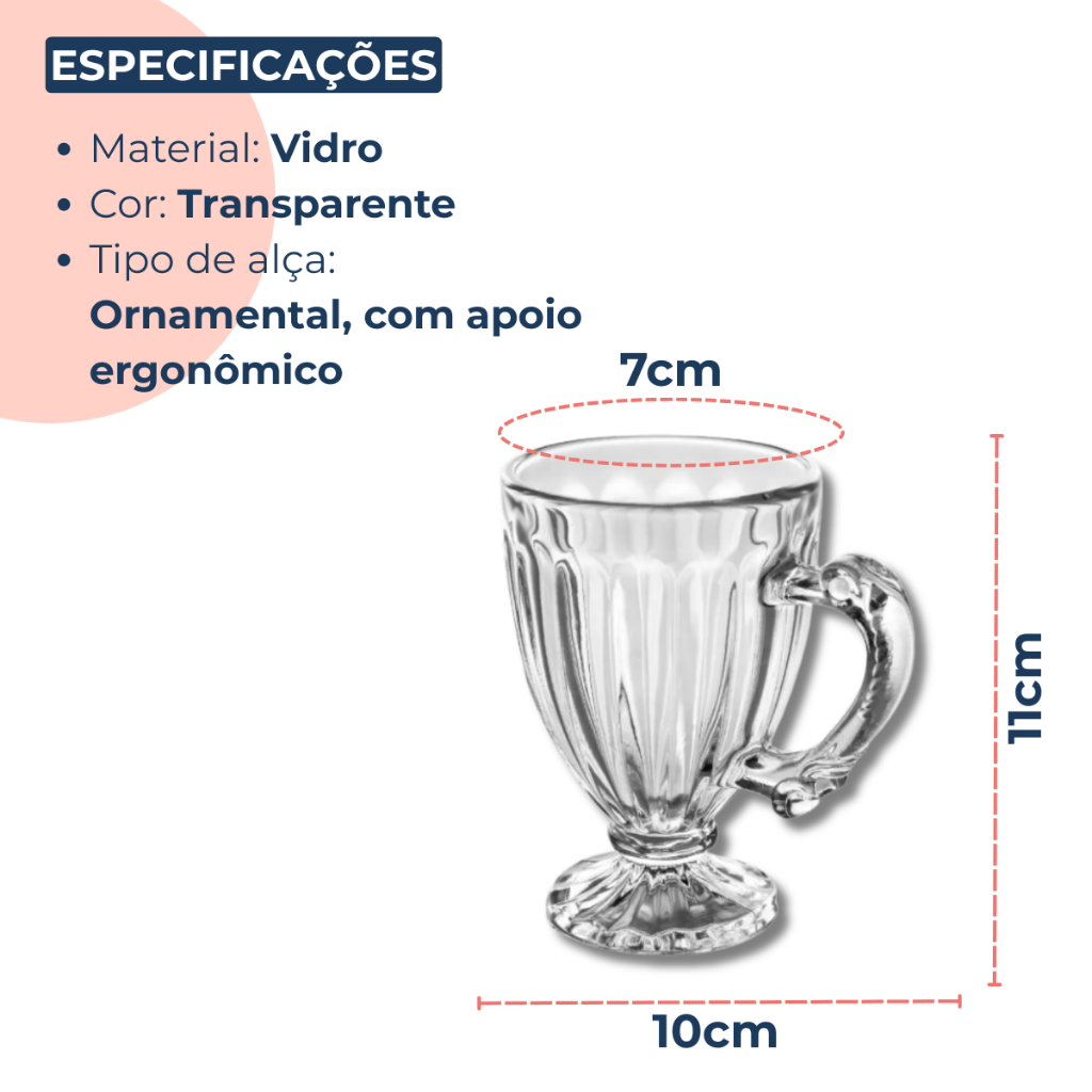 SOBRE O PRODUTO Leve charme e sofisticação à sua mesa com essa belíssima taça de cristal transparente. Com um design clássico e detalhado, ela é perfeita para servir bebidas quentes ou frias com muito estilo. Versátil e resistente, é indicada para uso doméstico ou profissional (cafeterias, bistrôs, confeitarias). Com acabamento em relevo e alta transparência, é uma peça versátil para uso diário ou decoração de mesas e eventos. Diferenciais: - Design elegante com detalhes em relevo. - Alta transparência e brilho. - Fácil de limpar. - Ideal para compor mesas sofisticadas ou ambientes retrô. ESPECIFICAÇÕES TÉCNICAS Material: Cristal Cor: Transparente Altura: 11 cm Diâmetro da boca: 7 cm Largura total (incluindo alça): 10 cm Estilo: Clássico com relevo vertical Tipo de alça: Ornamental, com apoio ergonômico