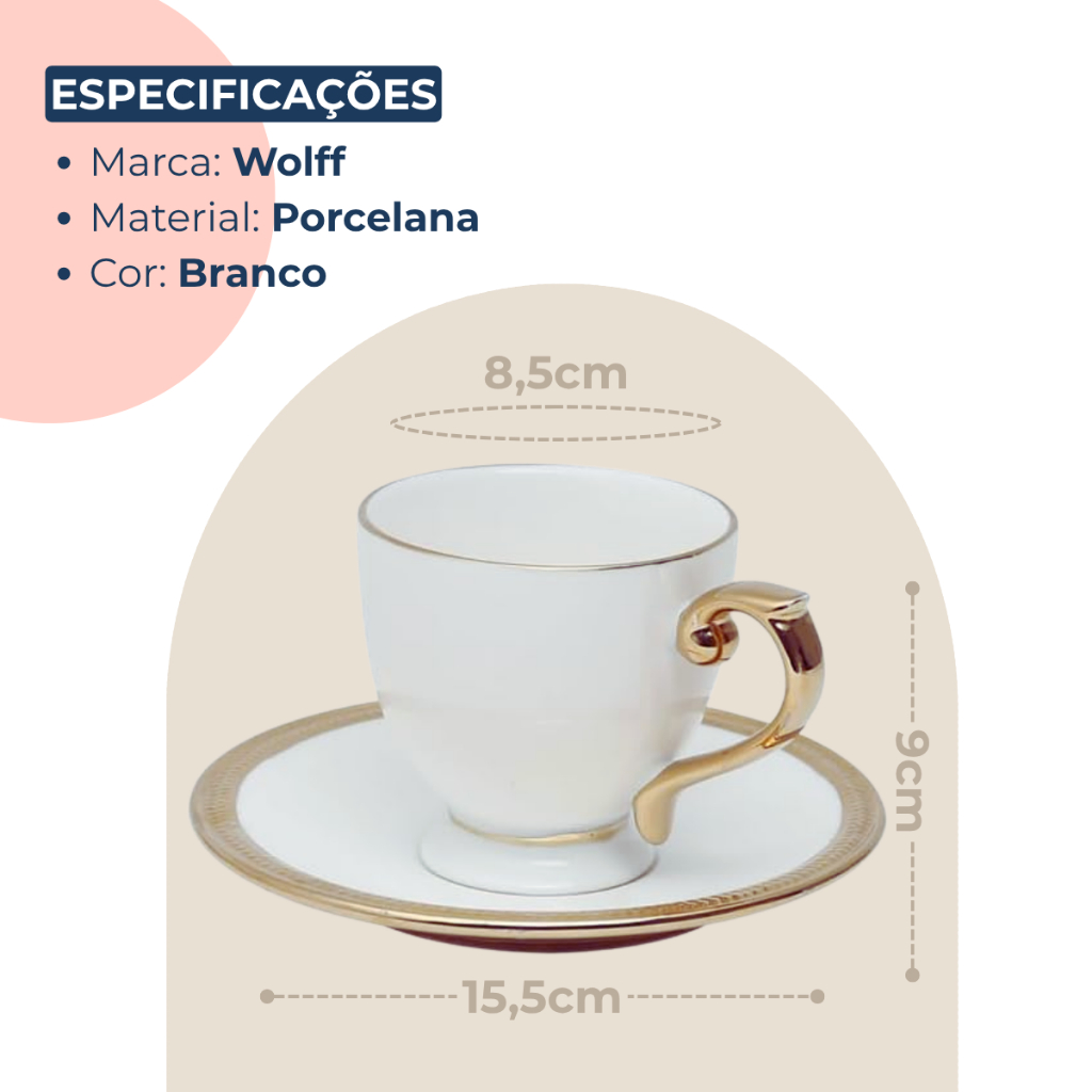 Jogo 6 Xícaras de Chá Café 200ml Porcelana Paddy Branca Borda Dourada Wolff