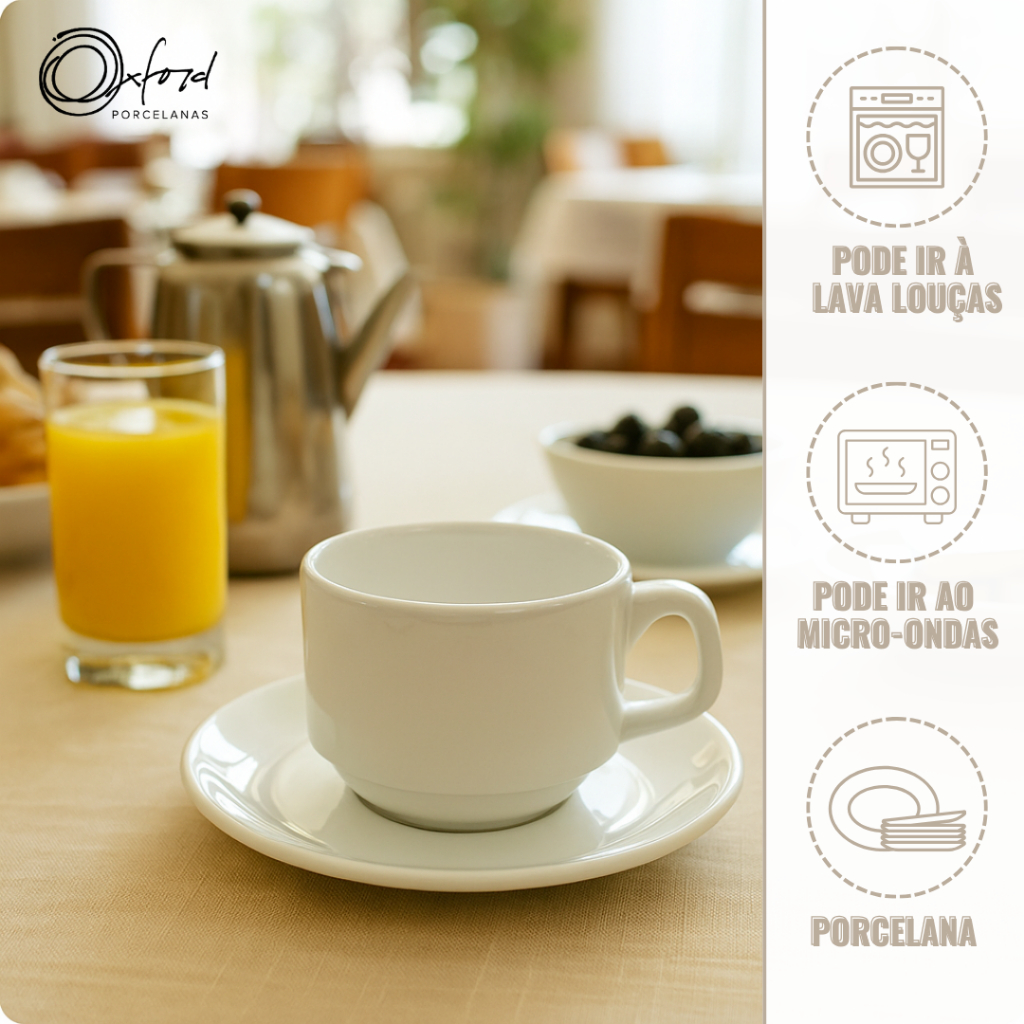 Jogo 6 Xícaras Empilhável 200ml Porcelana Branca Hotel Restaurante Com Pires Oxford
