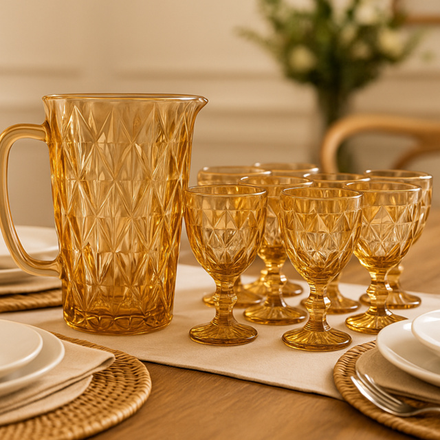 Jogo 7 Peças Jarra Vidro Diamond + 6 Taças Ambar Água Drinks Bico Jaca DIamante Abacaxi Dourada