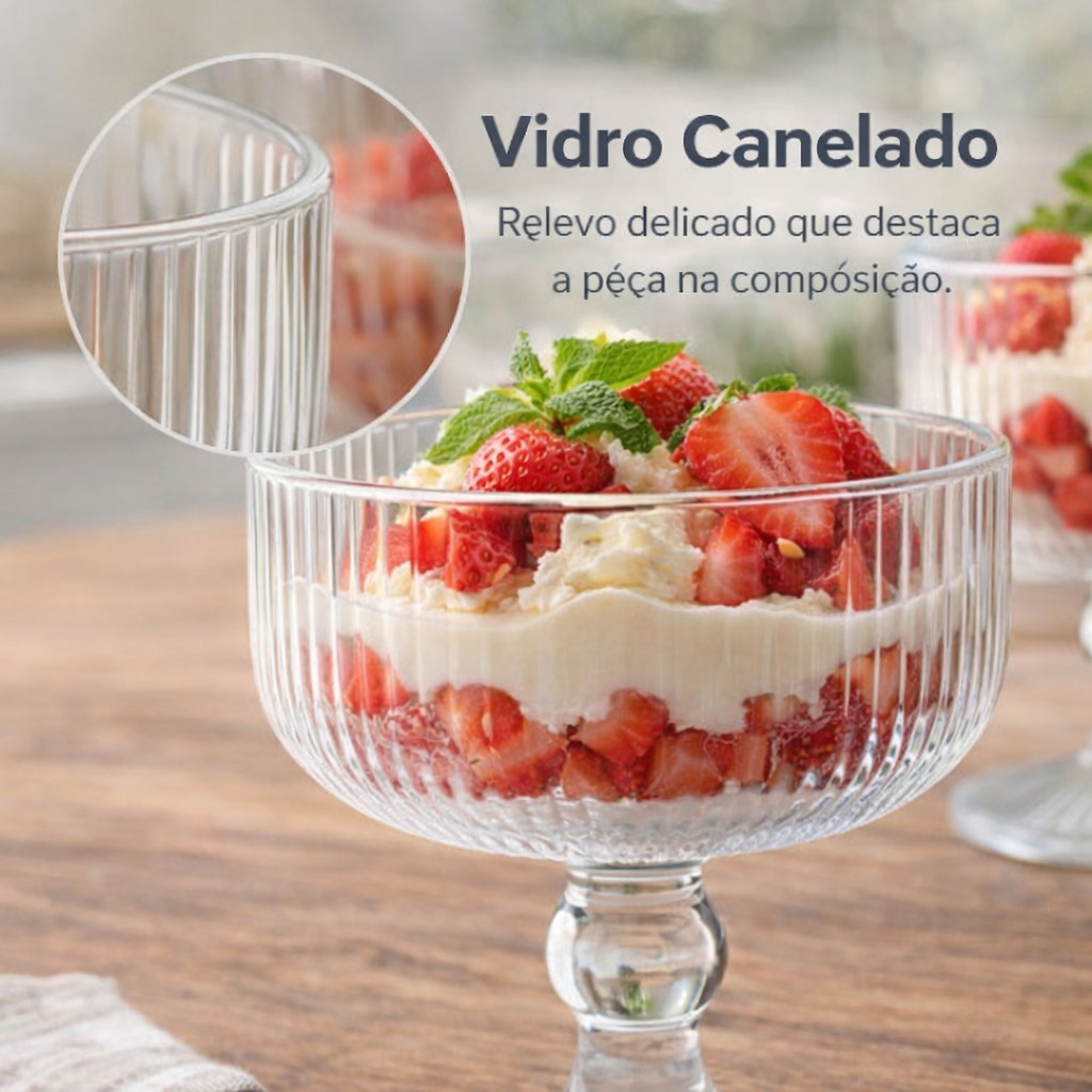 O Jogo de 8 Taças de Sobremesa em Vidro Canelado é ideal para quem busca sofisticação, qualidade e versatilidade na hora de servir. Com design elegante e acabamento canelado, valoriza a apresentação de sobremesas e compõe a mesa com muito mais charme. Design sofisticado e versátil O relevo vertical do vidro canelado traz personalidade à peça e cria um efeito visual refinado, perfeito para mesas modernas, ocasiões especiais ou uso no dia a dia. Vidro de qualidade e ótima estabilidade Produzidas em vidro espesso com excelente acabamento, as taças oferecem resistência, robustez e firmeza ao servir. Perfeitas para diversas sobremesas Com capacidade de 300ml por taça, são ideais para servir: • Sorvetes • Açaí • Mousses • Cremes • Frutas • Sobremesas elaboradas Também podem ser usadas para compor a mesa posta, cristaleira ou decoração do ambiente. Diferenciais do produto • Vidro de alta qualidade com acabamento canelado • Design elegante e versátil • Capacidade ideal para sobremesas • Valoriza a apresentação à mesa • Compatível com lava-louças Especificações • Material: Vidro • Capacidade: 300ml por taça • Conteúdo da embalagem: 4 taças ou 8 taças, escolher a variação Recomendações de uso • Compatível com lava-louças