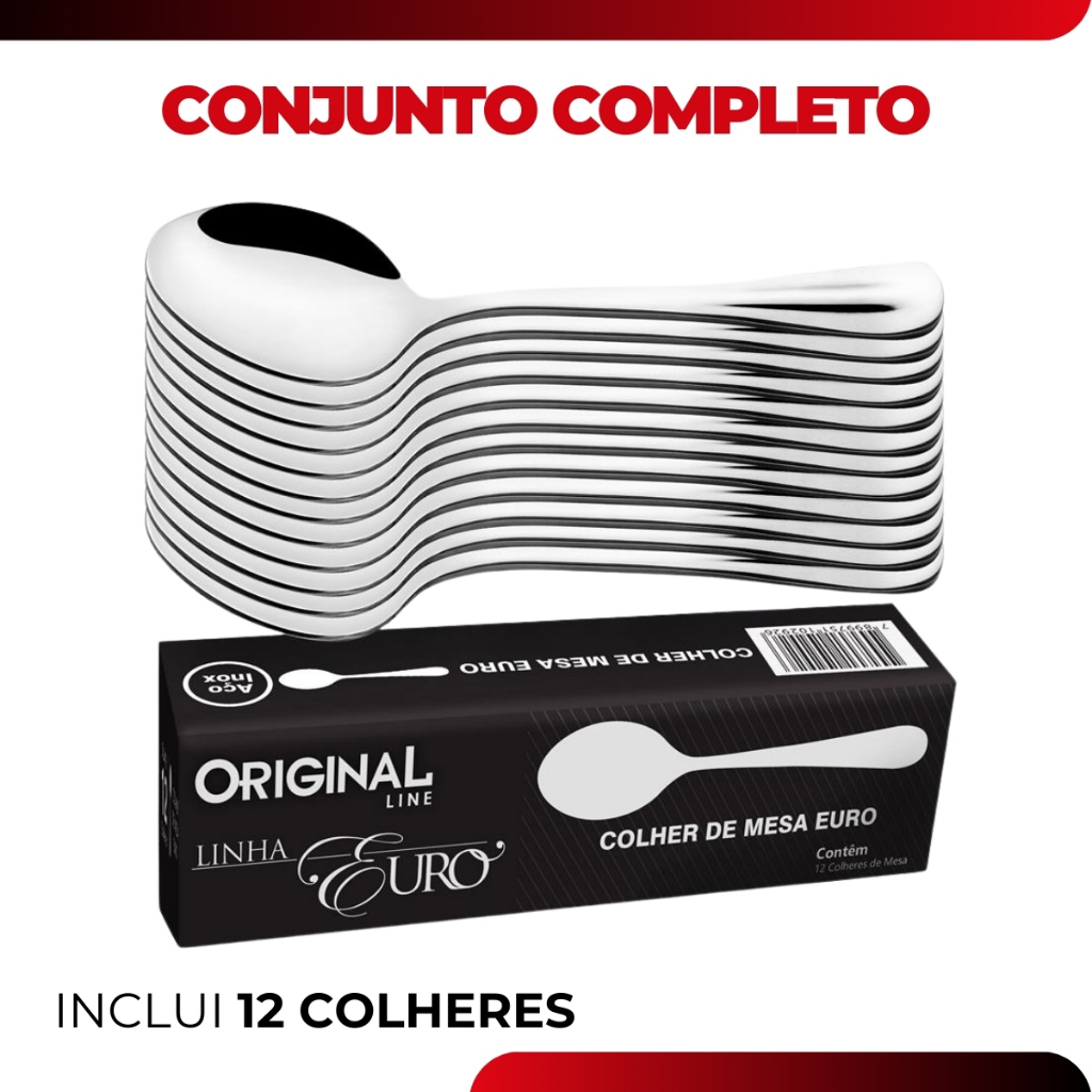 A Colher de Mesa Inox Euro com 12 pecas e perfeito para quem busca qualidade e elegancia em suas refeicoes. Feito em aco inoxidavel, tanto a lamina quanto o cabo, essa colher e resistente e duravel, garantindo sua satisfacao por muito tempo. Com um comprimento total de 20 cm, ele e ideal para uso em mesas de jantar, proporcionando conforto e praticidade. Adquira agora mesmo a Colher de Mesa Inox Euro com 12 pecas e tenha uma experiencia gastronomica ainda mais especial. Medidas: . Peso: 0,50 g . Comprimento: 20 cm . Largura: 2 cm . Espessura: 3 mm . Material: Aco inox . Marca: Original Line Conteudo Da Embalagem: . 12 Colheres Cuidados: Para manter seus talheres sempre brilhando, lave com esponja macia, sabao ou detergente neutro. Produtos abrasivos como palha de aco podem riscar e prejudicar o brilho. Seque imediatamente para evitar manchas. Recomenda-se o uso de agua quente para melhorar o brilho Nao guarde em local umido, a umidade pode provocar manchas. Importante: Garantia de 3 Meses. Valor do Kit. Imagens Meramente Ilustrativas. Nao nos responsabilizamos pelo mau uso do produto.