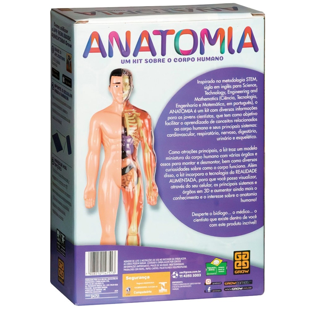 ***PRODUTO GROW EM PORTUGUÊS, ORIGINAL, OFICIAL, LACRADO E COM NOTA FISCAL*** JOGO ANATOMIA GROW UM KIT CORPO HUMANO REALIDADE AUMENTADA 3D APLICATIVO APP METODOLOGIA STEM ÓRGÃOS Inspirado na metodologia STEM, sigla em inglês para Science, Technology, Engineering and Mathematics (Ciência, Tecnologia, Engenharia e Matemática, em português), o ANATOMIA é um kit com diversas informações para os jovens cientistas, que tem como objetivo facilitar o aprendizado de conceitos relacionados ao corpo humano e seus principais sistemas: cardiovascular, respiratório, nervoso, digestório, urinário e esquelético. Como atrações principais, o kit traz um modelo miniatura do corpo humano com vários órgãos e ossos para montar e desmontar, bem como diversas curiosidades sobre como o corpo funciona. Além disso, o kit incorpora a tecnologia da REALIDADE AUMENTADA, para que você possa visualizar, através do seu celular, os principais sistemas e órgãos em 3D e aumentar ainda mais o conhecimento e o interesse sobre a anatomia humana! Desperte o biólogo... o médico... o cientista que existe dentro de você com este produto incrível! Importante: Para ver a Realidade Aumentada é necessário um smartphone ou tablet. Baixe o aplicativo Grow Realidade Aumenta disponível no Google Play e App Store. Como utilizar o APP REALIDADE AUMENTADA GROW 1) BAIXE O APLICATIVO - GROW Realidade Aumentada - Google Play ou App Store 2) APONTE O CELULAR A IMAGEM - Abra o aplicativo, selecione no menu o produto Anatomia. Aponte a câmera para uma das aberturas de capítulo do manual. 3) NAVEGUE NAS OPÇÕES O App tem muitas informações e imagens dos sistemas em 3D! Aproveite para aprender um pouco mais usando essa incrível tecnologia. - Sistemas: nervoso, esquelético, digestório, cardiovascular, respiratório e urinário. Informações Técnicas: - Material: Papel ,Papel Cartão, Polietileno e Polipropileno. - Contém: 1 modelo miniatura de corpo humano (Aproximadamente 30cm), 1 folheto com instruções e 1 manual - EAN: 7908010147513 - Código: 04751 - Produto certificado: INMETRO CE-BRI/ICEPEX-N 01264-25 - Dimensões da embalagem: 31,5 x 22,6 x 8,5 cm - Peso: 390g - JOGO - 8+ ANOS - GROW - Garantia: Contra defeitos de fabricação: 3 meses pelo fabricante - Prazo de Validade: Indeterminado Obs: O tamanho de cada peça pode sofrer variações. Imagens meramente Ilustrativas! ATENÇÃO! NÃO RECOMENDÁVEL PARA CRIANÇAS MENORES DE 3 (TRÊS) ANOS POR PODER GERAR PARTE(S) PEQUENA(S) QUE PODE(M) SER ENGOLIDA(S) OU ASPIRADA(S). --------------------------------------------------- SEJA MUITO BEM VINDO(A) A LOJA DE BRINQUEDOS DO CANAL 40 POR QUÊ COMPRAR NA LOJA DE BRINQUEDOS DO CANAL 40? *Enviamos seu pedido sempre no mesmo dia ou no máximo no próximo dia útil dependendo do horário da sua compra! *Produtos lacrados, originais e oficiais da mais alta qualidade; *Experiência única de compra (incluindo a experiência olfativa - você sentirá nosso cheiro); *Todos os nossos produtos estão à pronta entrega em nosso estoque físico aqui no Brasil; *Seu pedido será enviado com segurança e agilidade; IMPORTANTE: Tenha tranquilidade de comprar com quem está disposto a te oferecer o melhor atendimento, caso tenha algum problema após a compra, conte com nossa equipe de pós venda para solucioná-lo! A LOJA DE BRINQUEDOS DO CANAL 40 tem a missão de garantir a satisfação total do seu cliente, tanto nos produtos quanto no atendimento. Assim estabelecemos uma relação única de confiança! Não encontrou o que procurava? Clique na foto da nossa logo para entrar em nossa loja e ver todos os nossos produtos OU nos mande uma mensagem diretamente aqui pelo chat. SERÁ UM PRAZER ATENDÊ-LO(A)! --------------------------------------------------- MUITO PRAZER, ME CHAMO FELIPE CAMARGO, SOU DONO, CEO E CRIADOR DE CONTEÚDO DO CANAL 40. DESDE JÁ, DEIXO AQUI O MEU MUITO OBRIGADO!!! CANAL 40 - LOJA DE BRINQUEDOS LTDA DEIXE SUA CRIANÇA INTERIOR FELIZ E APROVEITE!