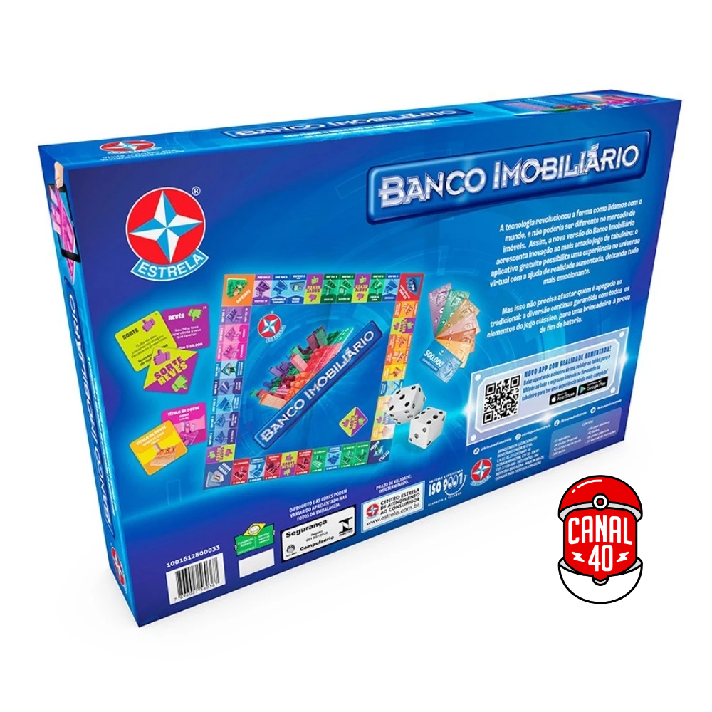 SEJA MUITO BEM VINDO(A) A LOJA DE BRINQUEDOS DO CANAL 40 POR QUÊ COMPRAR NA LOJA DE BRINQUEDOS DO CANAL 40? *Enviamos seu pedido sempre no mesmo dia ou no máximo no dia seguinte dependendo do horário da sua compra! *Produtos lacrados, originais e oficiais da mais alta qualidade; *Experiência única de compra (incluindo a experiência olfativa - você sentirá nosso cheiro); *Todos os nossos produtos estão à pronta entrega em nosso estoque físico aqui no Brasil; *Sempre temos novos cupons de descontos especiais; *Seu pedido será enviado com segurança e agilidade; *Possibilidade de frete grátis; *Possibilidade de parcelamento; IMPORTANTE: Tenha tranquilidade de comprar com quem está disposto a te oferecer o melhor atendimento, caso tenha algum problema após a compra, conte com nossa equipe de pós venda para solucioná-lo! A LOJA DE BRINQUEDOS DO CANAL 40 tem a missão de garantir a satisfação total do seu cliente, tanto nos produtos quanto no atendimento. Assim estabelecemos uma relação única de confiança! --------------------------------------------------- ***PRODUTO ESTRELA EM PORTUGUÊS ORIGINAL, OFICIAL, LACRADO E COM NOTA FISCAL*** JOGO BANCO IMOBILIÁRIO ESTRELA COM APLICATIVO APP BRINQUEDO MESA TABULEIRO DIVERSÃO FAMÍLIA CLÁSSICO LACRADO ORIGINAL DESVENDE O MERCADO DE IMÓVEIS MODERNO E SE TORNE UM INVESTIDOR MILIONÁRIO. O mercado de imóveis se modernizou e está cada vez mais competitivo. Diversificar os investimentos virou palavra de ordem. O Banco Imobiliário é um um incrivel jogo de tabuleiro no qual os participantes testam sua habilidade de negociação, compra e venda e administração de valores. Além disso, todo o dinamismo do mundo dos negócios foi trazido para os dias de hoje! Ande pelo tabuleiro e faça fortunas ao adquirir importantes vias de transporte e companhias, mas cuidado: as surpresas no caminho podem fazer com que você ganhe ou perca dinheiro. Se cair nas suas propriedades, você pode descansar ou planejar a proxima ação, mas se cair na propriedade de outra jogador, prepare-se: você vai ter que pagar o aluguel! A tecnologia revolucionou a forma como lidamos com o mundo, e não poderia ser diferente no mercado de imóveis. Assim, a nova versão do Banco Imobiliário acrescenta inovação ao mais amado jogo de tabuleiro: o aplicativo gratuito possibilita uma experiência no universo virtual com a ajuda de realidade aumentada, deixando tudo mais emocionante. Mas isso não precisa afastar quem é apegado ao tradicional: a diversão continua garantida com todos os elementos do jogo clássico, para uma brincadeira à prova de fim de bateria. NOVO APP COM REALIDADE AUMENTADA! Baixe apontando a câmera do seu celular ou tablet para o QRCode que está no verso do produto e veja seus imóveis se formando no tabuleiro para ter uma experiência ainda mais completa! - Baixar na App Store - DISPONÍVEL NO Google Play Especificações técnicas: - Altura / Largura / Comprimento da embalagem (centímetros): 27 x 7 x 40cm - Peso da embalagem (gramas): 1060G - Idade A partir de 8 anos - Contém na Embalagem: 1 tabuleiro, 28 títulos de propriedade, 32 cartões Sorte ou Revés, 380 notas, 80 casas plásticas, 2 dados, 6 peões e 1 manual de instruções. - Composição/material(is): Cartonado e plástico - Selo de Segurança do Inmetro: 001 807/2020 - Garantia: Produto com garantia de 90 dias contra defeitos de fabricação - Efeitos/ Funcionalidades e Benefícios: Entretenimento e raciocínio lógico - Interatividade do Produto: Tabuleiro - Objetivo do Jogo: Conseguir cuidar bem do seu dinheiro e dos investimentos e ser o último jogador a falir! - Tempo Médio de Jogo: 120 minutos - Jogadores: Para 2 a 6 jogadores - Marca: Estrela - Prazo de validade: Indeterminado - INMETRO REGISTRO: 001 807/2020 | OCP 0006 O PRODUTO E AS CORES PODEM VARIAR DO APRESENTADO NAS FOTOS DA EMBALAGEM. ATENÇÃO! NÃO RECOMENDÁVEL PARA CRIANÇAS MENORES DE 3 (TRÊS) ANOS POR PODER GERAR PARTE(S) PEQUENA(S) QUE PODE(M) SER ENGOLIDA(S) OU ASPIRADA(S). --------------------------------------------------- Não encontrou o que procurava? Clique na foto da nossa logo para entrar em nossa loja e ver todos os nossos produtos OU nos mande uma mensagem diretamente aqui pelo chat. SERÁ UM PRAZER ATENDÊ-LO(A)! --------------------------------------------------- MUITO PRAZER, ME CHAMO FELIPE CAMARGO, SOU DONO, CEO E CRIADOR DE CONTEÚDO DO CANAL 40. DESDE JÁ, DEIXO AQUI O MEU MUITO OBRIGADO!!! CANAL 40 - LOJA DE BRINQUEDOS LTDA DEIXE SUA CRIANÇA INTERIOR FELIZ E APROVEITE!