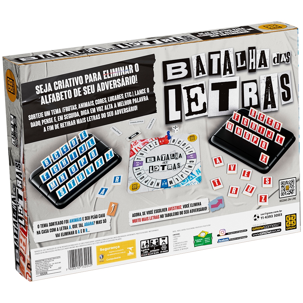 Jogo Batalha das Letras Você é capaz de formar várias palavras com as letras do seu oponente em pouco tempo? Descubra jogando Batalha das Letras da Grow! Esse jogo de tabuleiro vai desafiar seu intelecto das mais diversas formas e promete ser a diversão ideal entre adultos e crianças! Seja criativo e rápido o bastante para conseguir derrotar seu adversário antes que ele forme mais palavras do que você! Como jogar Batalha das Letras? O jogo Batalha das Letras é ideal para 2 participantes a partir dos 7 anos! Para brincar com esse jogo de palavras, basta vocês escolherem um tema. Ele pode ser qualquer um: frutas, carros, flores, cores e muito mais. Depois, role o dado e diga a melhor palavra sobre esse tema que você conseguiu pensar. Assim, você consegue derrubar mais letras do exército do seu adversário! Não entendeu? Aqui vai um exemplo: suponha que o tema escolhido é FLORES, e a letra sorteada é M. Neste caso, você pode falar MARGARIDA. A partir daí, as letras M, A, R, G, A, R, I, D e A do seu adversário são derrubadas. Todas as regras do jogo Batalha das Letras estão incluídas junto com o manual do jogo. Basta encontrar suas companhias, seguir as regras e partir para a diversão! Idade: A partir de 7 anos Participantes: 2 Tempo estimado de jogo: 30 minutos Como Funciona o jogo batalha das letras