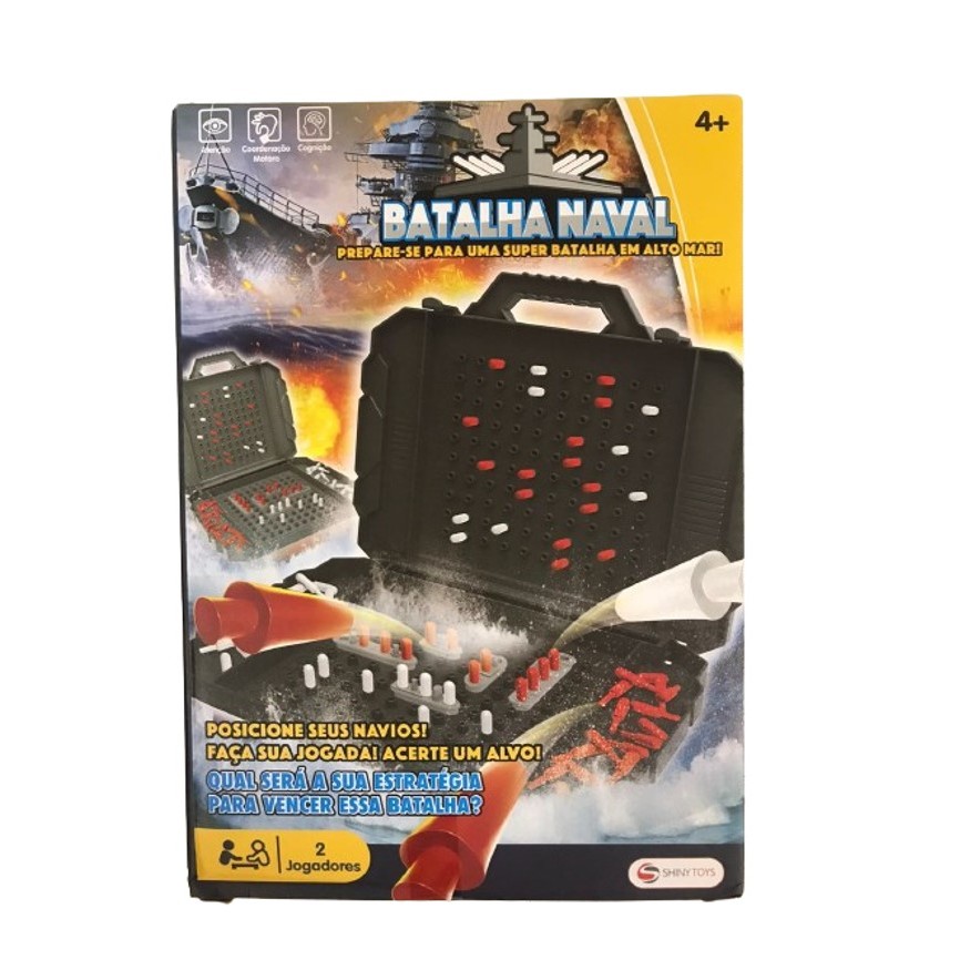 Prepare-se para a Batalha! No jogo Batalha Marítima uma boa estratégia fará você vencer, ou terá seus navios atingidos pelo bombardeio inimigo! Posicione estrategicamente seus navios pelo oceano. Faça suas jogadas atirando nas posições inimigas. Marque em seu tabuleiro os locais onde realizou seus disparos. Quando atingir um navio inimigo, continue atirando na sequência até afundá-lo no mar! Um ótimo jogo de estratégia para a criançada pensar e se divertir! Especificações: Marca: Shiny Toys Referência: 1258 Cód. Barras: 7908650702905 Idade recomendada 4+ anos. Dimensões do Produto na Embalagem: 23 x 16 x 7 cm Peso: 214 g Garantia do Fabricante: 3 meses Garantia do Vendedor: 7 dias Produto Novo, Original, Lacrado e Acompanhado de Nota Fiscal.