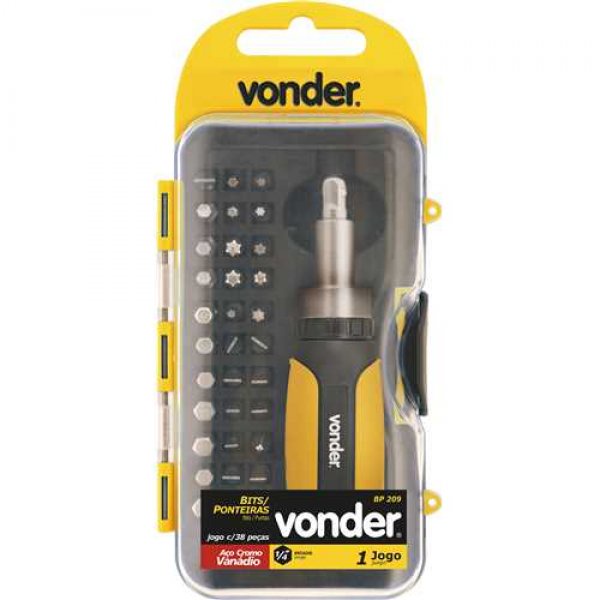 Indicado para fixar e soltar parafusos em geral. Produzido em aço cromo vanádio, proporcionando maior resistência e durabilidade. Possui acabamento Fosfatizado que aumenta a proteção contra oxidação/corrosão. Conteúdo da Embalagem: - 1 Jogo de bits/ponteiras, composto por um estojo plástico com 38 pecas, sendo: 1 cabo adaptador encaixe 1/4" com catraca reversível, 1 adaptador encaixe quadrado 1/4" e sextavado 1/4", 8 fenda (4 mm, 5 mm, 5,5 mm e 6 mm (2 pecas cada)), 10 phillips (n? 0 (3 pecas), n? 1 (4 pecas) e n? 2 (3 pecas)), 10 hexalobular (T10, T15, T20, T25 e T30 (2 pecas cada)) e 8 allen (4 mm (3 pecas), 5 mm (3 pecas) e 6 mm (2 pecas)). Detalhes Técnicos: - Tipo do encaixe do bits: Sextavado - 1/4" (6,35 mm) - Comprimento total do bits/ponteira:25 mm - Material do bits/ponteira: Aço cromo vanádio - Acabamento do bits: Fosfatizado - Massa aproximada (peso):0,425 kg