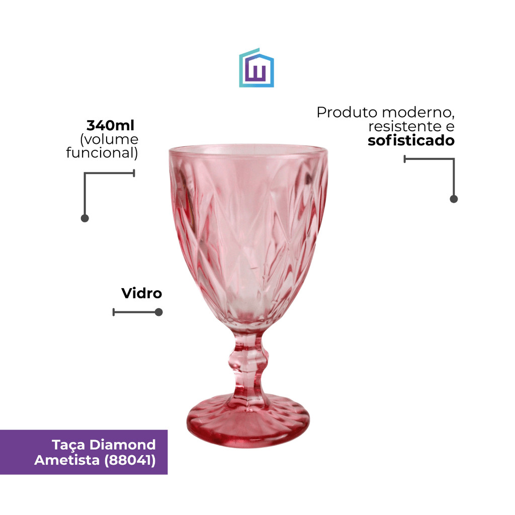 | Jogo C/ 6 Taças Diamond Rosa Ametista 340ml Mesa Posta Bebidas Água... este produto | R$ 79,90 | 38% | 5.0/5 | 4 |