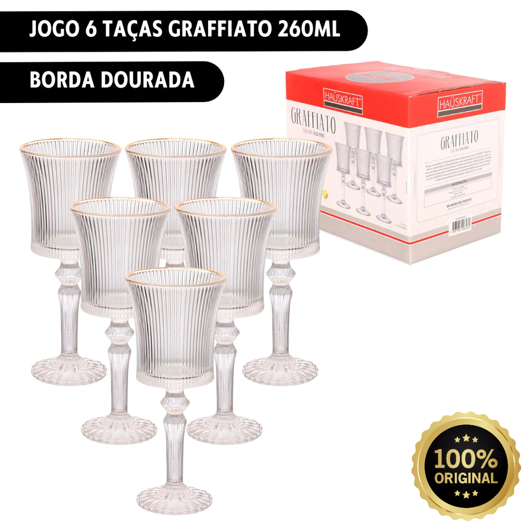 | Jogo c/ 6 unid Taça 260ml Graffiato Filete Dourado Vidro Hauskraft este produto | R$ 125,90 | — | 5.0/5 | 3 |