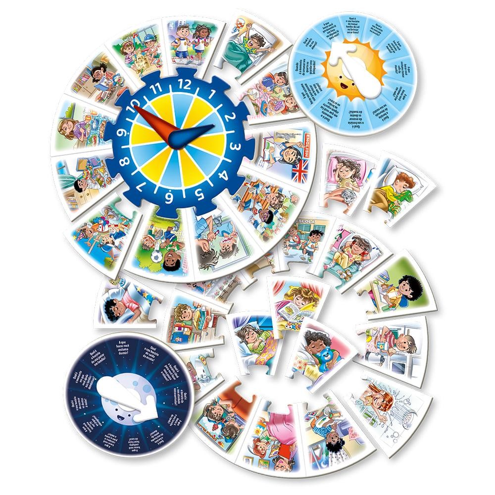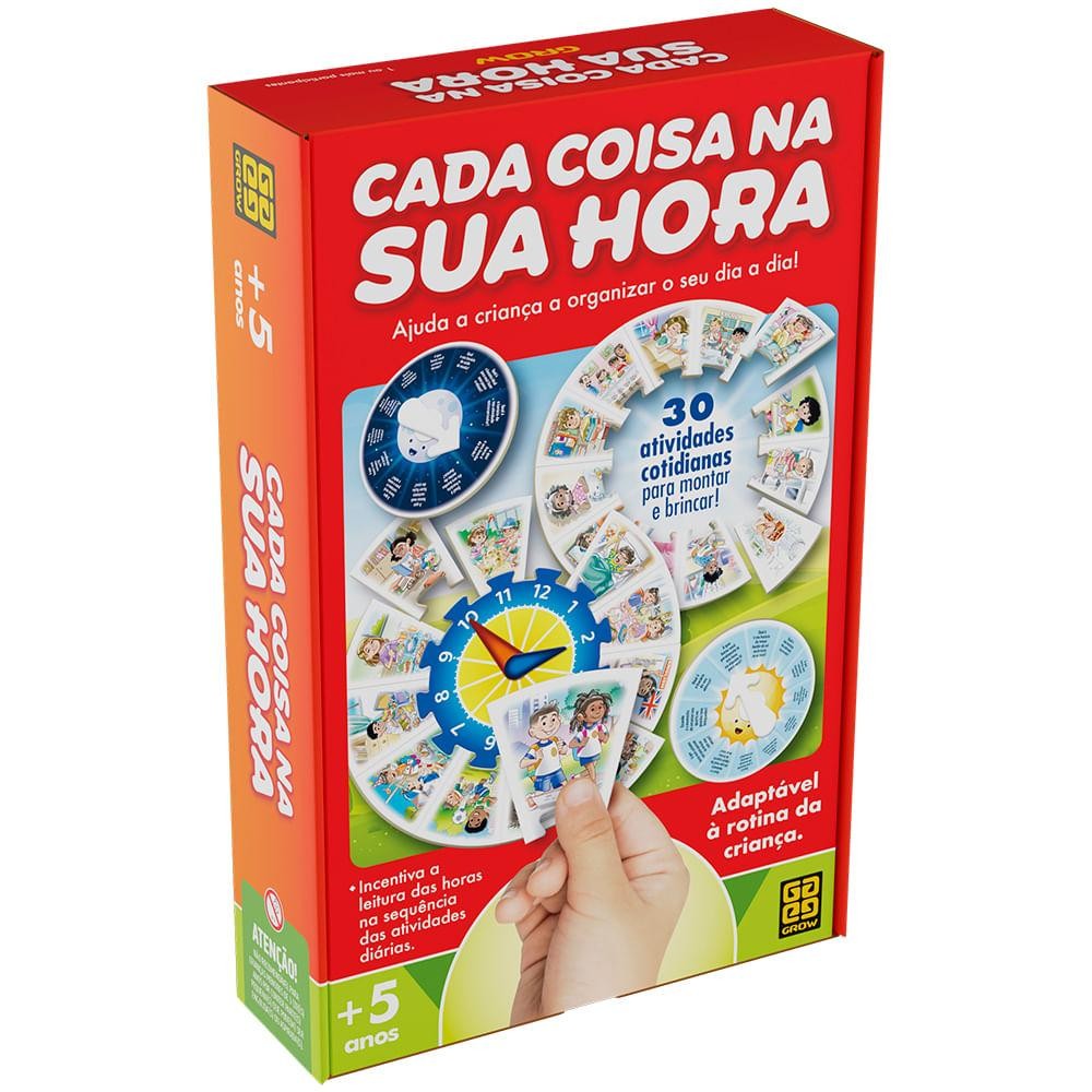 Linha Brincando & Aprendendo Grow CADA COISA NA SUA HORA ajuda as crianças a entenderem a relação entre horários e suas rotinas diárias. Um jogo que oferece uma oportunidade excelente para entender sua importância do gerenciamento do tempo e da autonomia. Com uma variedade de cartas ilustradas com atividades cotidianas e as roletas com perguntas, as crianças podem personalizar a montagem de sua própria rotina. Por exemplo, ao girar a roleta, a criança pode ser desafiada com perguntas como: A que horas você toma café da manhã?. Ela, então, seleciona a ilustração correspondente e a encaixa no relógio. A partir de 5 anos Participantes: 1 ou mais Contém: 1 Relógio cartonado, 30 peças ilustradas, 2 roletas e 2 setas.