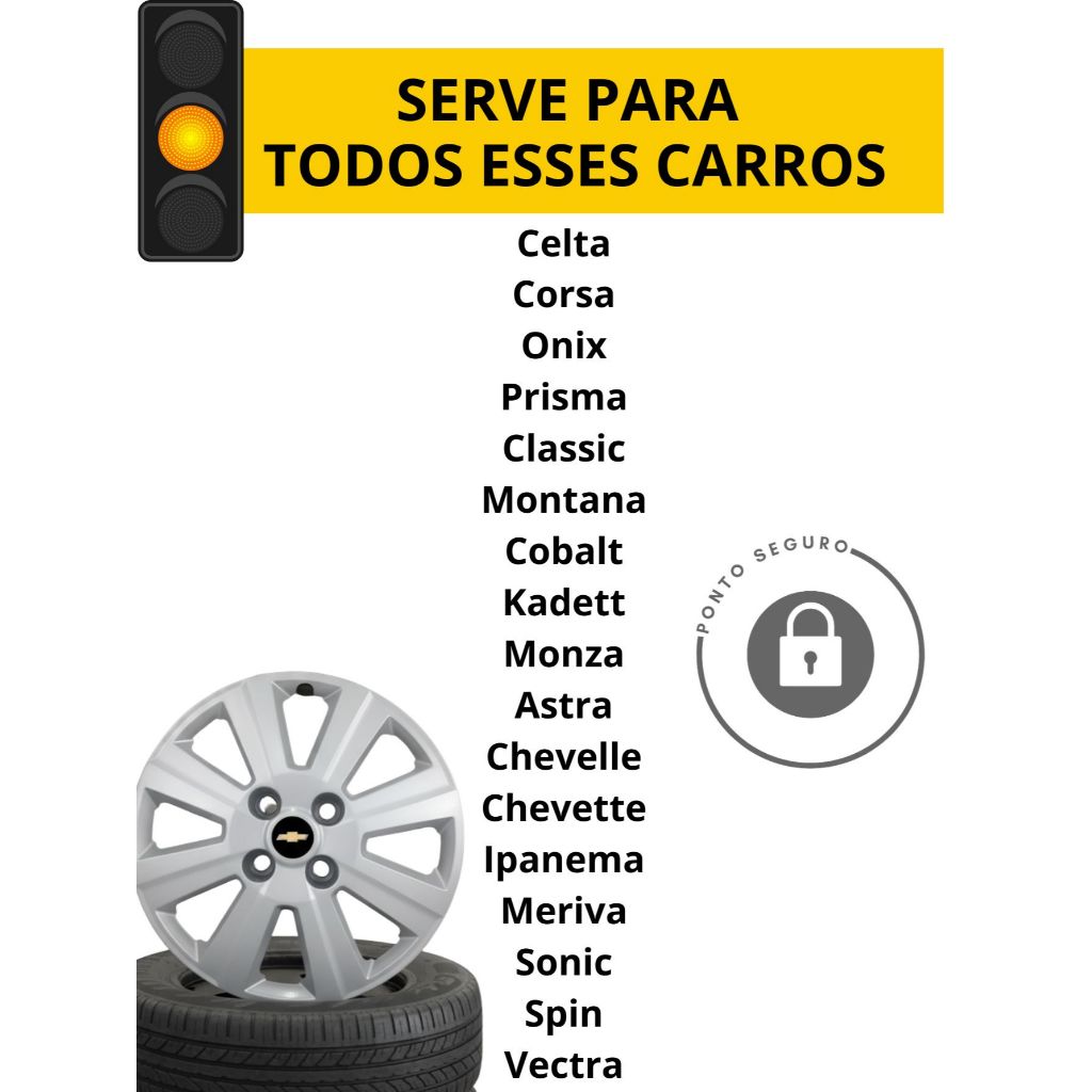 Renove o visual do seu Chevrolet com o nosso Jogo de Calotas Aro 14! ✨ Este kit oferece o melhor em segurança e estética, com fixação pelos próprios parafusos ou porcas da roda, garantindo que suas calotas fiquem firmes e seguras. Produto de excelente qualidade e acabamento, que deixará seu carro mais estiloso! ⚙️ Características do Produto: 📦 Jogo Completo: 4 Calotas Aro 14 (Valor referente ao kit). 🎨 Cor: Prata (Acabamento brilhante e elegante). 🏭 Marca: Callmax. 🛡️ Fixação Segura: Utiliza os Próprios Parafusos ou Porcas da Roda (Máxima segurança!). 🌟 Emblema: Com emblemas da GM inclusos, conforme a imagem (Toque final de originalidade). 🚨 Aplicação: Somente em rodas de ferro. 🆕 Produto: Novo, de excelente qualidade e acabamento. 🛠️ Guia Rápido de Instalação Segura: A instalação é simples e feita com as próprias ferramentas do seu veículo! Para Veículos com Parafusos: 1. 🔧 Remova os parafusos da roda. 2. 🔩 Encoste a calota na roda, alinhando os furos da calota com os furos da roda. 3. ✅ Por fim, parafuse os parafusos novamente e certifique-se que estão bem fixados. Para Veículos com Porcas: 1. 🔧 Remova as porcas da roda. 2. 🔩 Encaixe a calota na roda, alinhando os furos com os prisioneiros da roda. 3. ✅ Por fim, aplique as porcas novamente nos prisioneiros de seu veículo, garantindo a fixação. 🚗 Ampla Compatibilidade Chevrolet (Todos os Anos): Este kit é compatível com uma vasta linha de veículos GM que utilizam rodas de ferro Aro 14: Celta Corsa Onix Prisma Classic Montana Cobalt Kadett Monza Astra Chevelle Chevette Ipanema Meriva Sonic Spin Vectra ⚠️ Aviso Importante: 🛠️ Não nos responsabilizamos por montagem e instalação. Sempre verifique se os parafusos ou porcas estão bem fixados após a instalação. ❓ Tire suas dúvidas no campo de perguntas antes de comprar! 🛒 Compre Agora! Garanta já o seu Jogo de Calotas e dê um visual renovado e seguro ao seu Chevrolet! Clique em "Comprar Agora"! 🚀