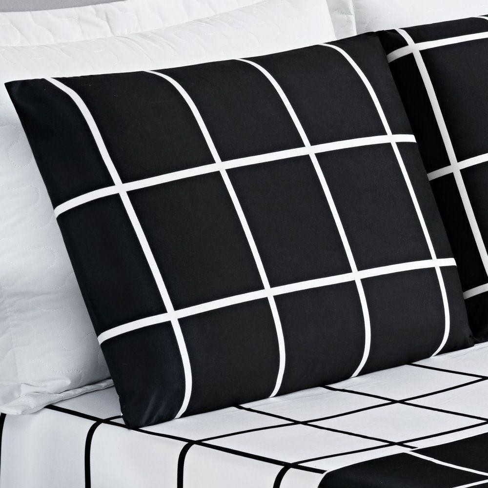 Jogo Cama Lençol Brooklyn Casal Quadriculado Micropercal 200 Fios 4 Peças - Preto Vista sua cama com o mix de cores e padrões do Jogo de Cama Brooklyn. Levando originalidade e estilo para a sua decoração, o conjunto possui acabamento e estampas modernas. Além de beleza, o conforto dos seus momentos de descanso são garantidos com o tecido Micropercal 200 Fios. Contém na embalagem: 01 Lençol de Cima 2,40m x 2,20m 01 Lençol de Baixo c/ Elástico p/ colchão 1,88m X 1,38m X 30cm alt. 02 Fronhas 70cm X 50cm Composição: Tecido - 100% Poliéster. As fotos são meramente ilustrativas. As cores podem variar de acordo com cada monitor e não representam todas as peças que compõem a descrição do produto.Fique atento à descrição do produto.