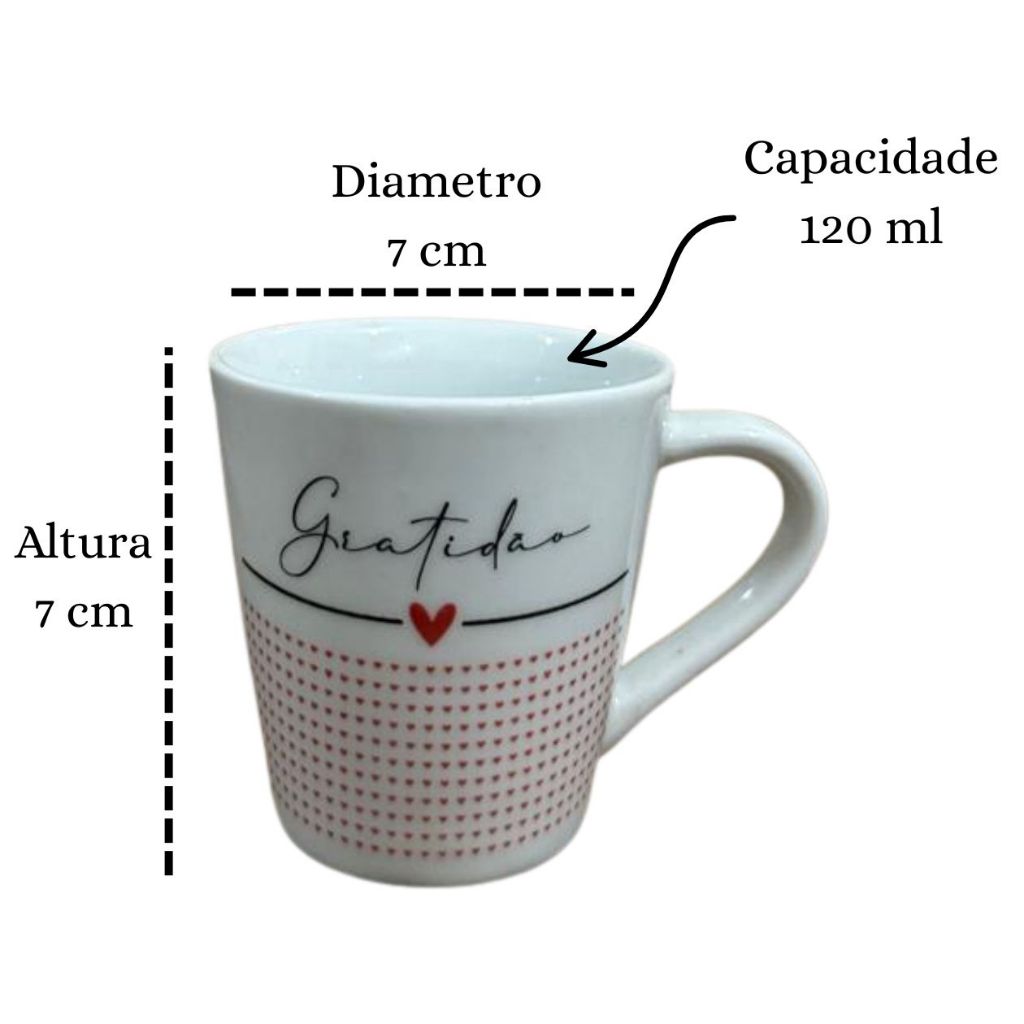 Bem Vindos (a) a Alice Porcelana Trabalhamos com Caneca Porcelana Jogo de xícara Canecas personalizadas xícara Café Chá ,caneca Branca lisa xícara para Hotel Padaria conveniência tudo para decorar seu ambiente Nossos Jogo de xícara Gratidão são um toque de elegância na sua cozinha mesa deixando seu momento com um toque a mais de delicadeza , Com uma decoração impecável cores vivas nossas xícara personalizada Gratidão são todas queimadas em um forno industrial a 1300 Graus dando uma qualidade e durabilidade melhor as caneca As Caneca 120ml são o tamanho ideal para dar de presente a familiares amigos colegas , também uma otima opção para fazer sextas de chocolate , sexta dia dos namorados . Capacidade: 120ml Altura: 7 cm Diametro: 7 cm Material: Porcelana Embalagem: Nossas Caneca Porcelana Gratidao são todas embaladas com maior carinho para que receba as xícara em perfeitas condições