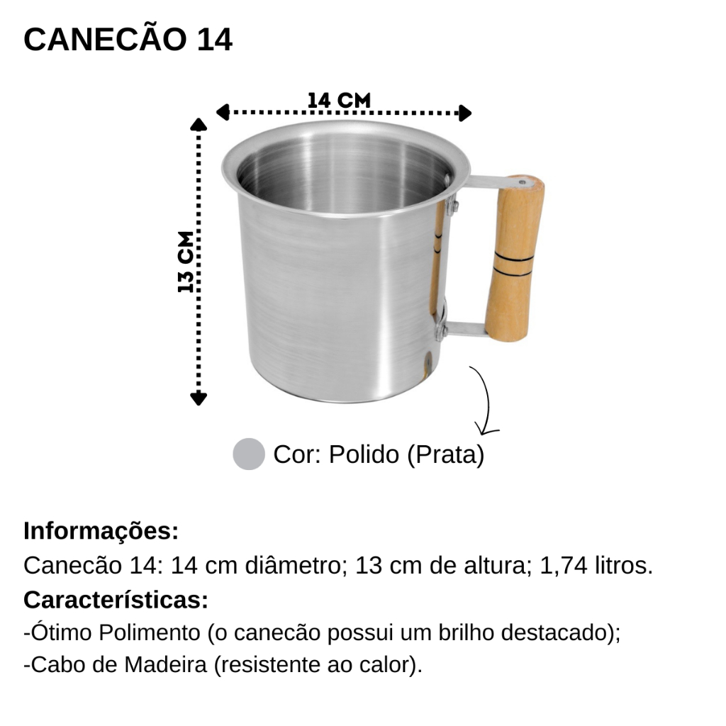 Confira o Jogo de Canecão de Alumínio com Cabo de Madeira 3 Peças, uma combinação perfeita de elegância e funcionalidade para sua cozinha. Este conjunto inclui: • 1 CANECÃO 12: Capacidade de 1,26 litros, 13cm de altura e 12cm de diâmetro interno. • 1 CANECÃO 14: Capacidade de 1,74 litros, 13cm de altura e 14cm de diâmetro interno. • 1 CANECÃO 16: Capacidade de 2,5 litros, 14cm de altura e 16cm de diâmetro interno. Perfeito para preparar deliciosos leites e outras bebidas quentes, este conjunto é indispensável para o dia a dia na cozinha. Feito em alumínio resistente, garante durabilidade e eficiência no preparo das suas receitas favoritas. Vantagens do Produto: • Design Clássico e Elegante: Acrescente sofisticação à sua cozinha com este jogo que une beleza e funcionalidade. • Aquecimento Rápido e Uniforme: O material em alumínio proporciona um aquecimento eficiente, resultando em preparos rápidos e perfeitos. • Cabo de Madeira: Um toque de sofisticação e segurança, tornando o manuseio mais confortável. • Fácil Limpeza e Armazenamento: Praticidade no dia a dia, facilitando sua rotina na cozinha. Porque não perder essa oportunidade ? • Durabilidade: Invista em um produto que vai te acompanhar por muitos anos, mantendo a qualidade e eficiência. • Versatilidade: Atenda diversas necessidades culinárias com apenas um conjunto. • Promoção Exclusiva: Aproveite nossa oferta especial e leve para casa este conjunto essencial por um preço imperdível! Não perca a oportunidade de transformar sua cozinha com o Jogo de Canecão de Alumínio com Cabo de Madeira. Adquira o seu agora e desfrute de toda a praticidade e elegância que ele oferece.
