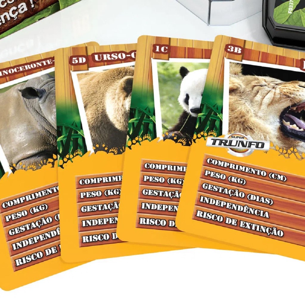 DESCRIÇÃO DO PRODUTO Super Trunfo Animais Selvagens traz 32 cartas com imagens e informações de animais selvagens para uma disputa superdivertida! Você compara sua carta com a do outro jogador. Mas escolha bem a característica que vai utilizar a cada rodada, pois, se sua carta ganhar, você fica com a carta do outro jogador; se perder, ele fica com a sua! No final, vence quem ganha todas as cartas do jogo. CARACTERÍSTICAS TÉCNICAS Conteúdo da Embalagem: 1 baralho com 32 cartas, 1 caixinha plástica e 1 manual de instruções Dimensões Aproximadas da Embalagem: 16 x 10 x 3 cm (Altura x Largura x Comprimento/Profundidade) Material/Composição: Papel, Plástico Idade Mínima Recomendada: A partir de 3 anos Participantes: A partir de 1 pessoa Alimentação: Não se aplica Marca: Grow Referência: 01816 Outras informações: As cores podem variar entre as imagens mostradas acima e o produto. Imagens meramente ilustrativas. Aviso: As informações e imagens divulgadas são de total responsabilidade do fabricante/fornecedor. Produto lacrado e disponível a pronta entrega para todo Brasil! APROVADO PELO INMETRO