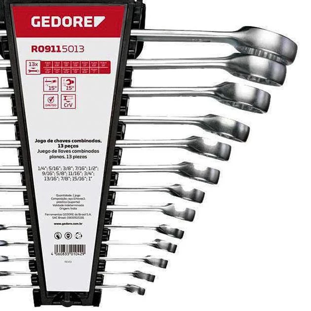 Jogo de chaves combinadas, pol. (RED R09115013) Descrição e Características do Produto: - Fabricadas conforme normas DIN 3113 forma A, ISO 3318 e ISO 7738; - Posição da cabeça (lado estrela) 15°; - Posição da boca 15°; - Acabamento cromado fosco; - Aço cromo-vanádio GEDORE red; - Com suporte especial GEDORE red. Dados Técnicos: - Acabamento: Aço; - Quantidade de itens: 13 pecas; - Referencia: R09115013; - Peso: 2,000kg. Itens Inclusos: - 13 Chaves Combinadas, sendo: 1/4"; 5/16"; 3/8"; 7/16"; 1/2"; 9/16"; 5/8"; 11/16"; 3/4"; 13/16"; 7/8"; 15/16"; 1".