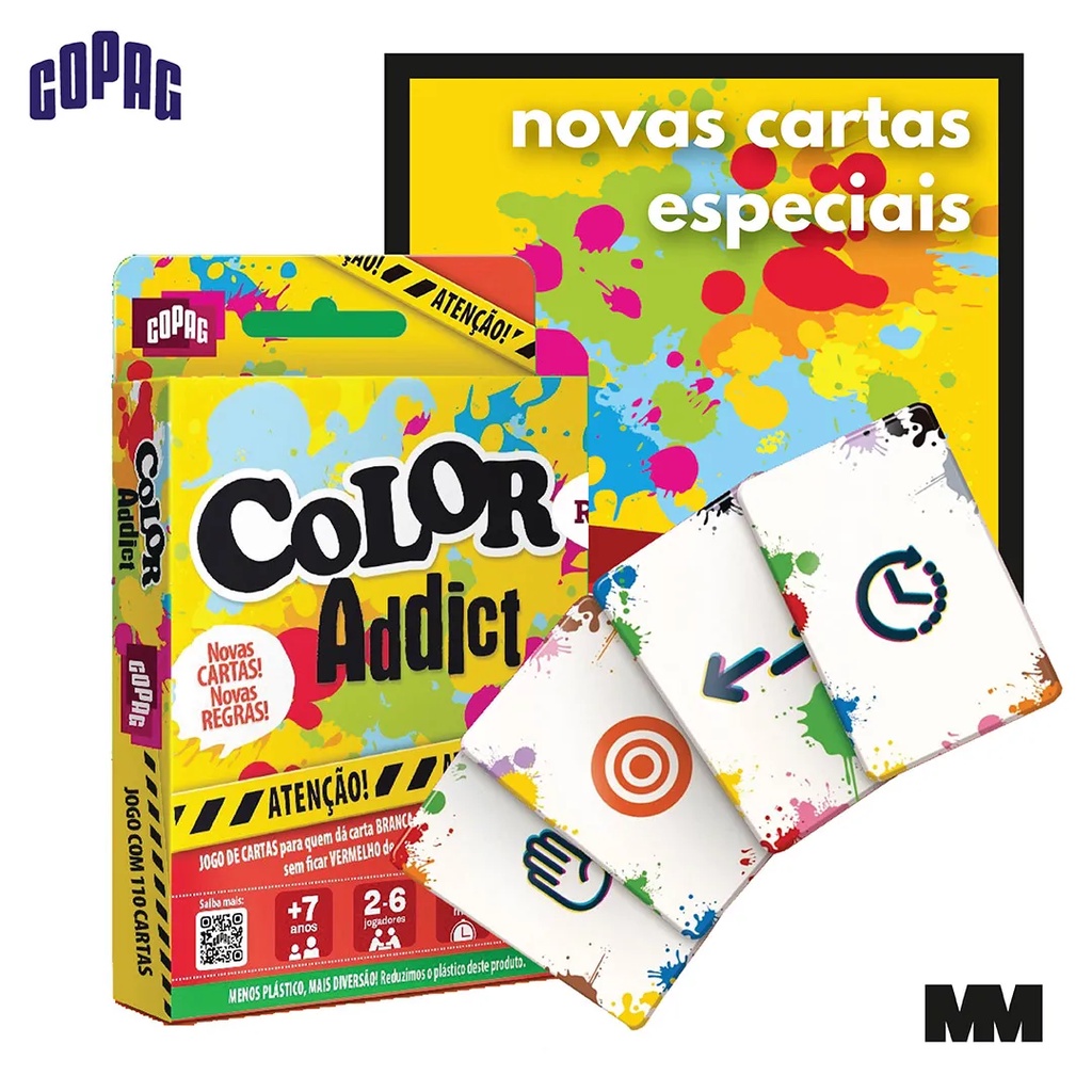 Descrição Do Produto: Leve Color Addict com você em todos os lugares! Mostre suas verdadeiras cores! Com a família, com os amigos, no escritório, na escola ou no avião, você vai pirar em todas as cores! Livre-se de suas Cartas o mais rápido possível sobrepondo palavras, cores, os dois ou o oposto... Color Addict é um jogo de cartas não recomendado para cardíacos, gatos cinzentos, elefantes cor-de-rosa, homenzinhos verdes, lobos brancos, etc. Novas cartas especiais: Seja o mais rápido em se livrar das suas cartas, obtenha vantagens congelando seus adversários, fazendo eles jogar com apenas uma mão ou fazendo com que comprem cartas. CARACTERÍSTICAS TÉCNICAS Conteúdo da Embalagem: 110 Cartas Dimensões Aproximadas da Embalagem: 16cm x 4cm x 10cm (Altura x Largura x Comprimento/Profundidade) Material/Composição: Plástico e Papel Idade Mínima Recomendada: 7 anos ou mais Participantes: de 2 a 6 jogadores Marca: COPAG Referência: 32410 Outras informações: As cores podem variar entre as imagens mostradas acima e o produto. Imagens meramente ilustrativas. Produto não recomendado para crianças menores de 3 anos, por conter partes pequenas que podem ser engolidas ou aspiradas. Aviso: As informações e imagens divulgadas são de total responsabilidade do fabricante/fornecedor. Produto lacrado e disponível a pronta entrega para todo Brasil! APROVADO PELO INMETRO