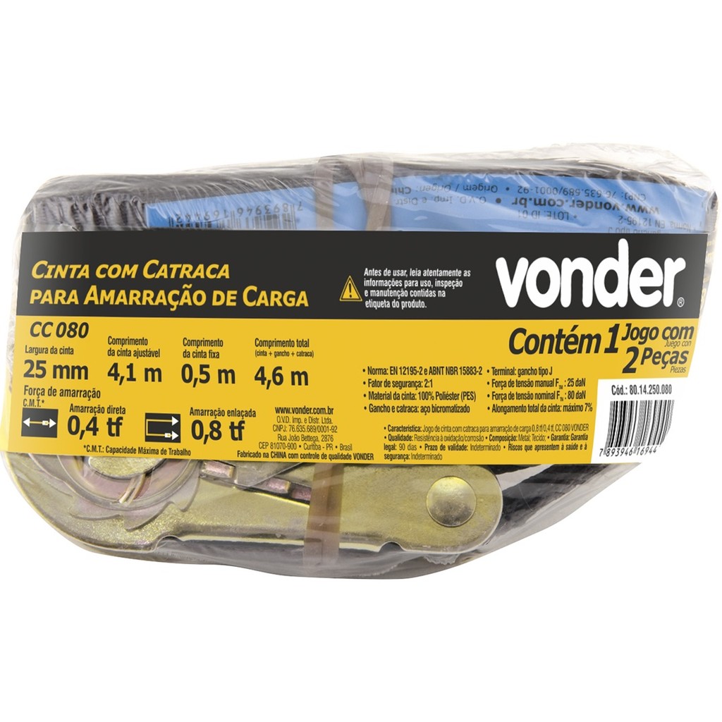 Jogo com 5 Cintas Catraca Amarração Carga 0.8Tf Cc 080 Vonder Possui gancho (terminal de fixação) tipo "J". Catraca e gancho fabricados em aço bicromatizado, proporcionando boa resistência à oxidação. Indicado para amarração de cargas. Proibido uso de alavanca no punho da catraca móvel. Proibido uso para içamento de cargas. Não utilizar em cantos vivos ou arestas sem as devidas proteções, não exceder a carga de trabalho. Especificações Técnicas: Material da cinta: Poliéster Material dos acessórios da cinta: Aço bicromatizado Cor: Preta Largura da cinta: 25 mm Comprimento da cinta ajustável: 4,1 m Comprimento da cinta fixa: 0,5 m Comprimento total do conjunto: 4,6 m Carga de trabalho em amarração direta: 0,40 tf Carga de trabalho em amarração enlaçada: 0,80 tf Carga de ruptura: 1,6 tf Fator de segurança: 2:1 Força de tensão manual: 25 daN Força de tensão nominal: 80 daN Alongamento total da cinta: Máximo 7% Norma de referência da cinta: NBR 15883-2 Terminal de fixação: Jota Massa aproximada (peso) (kg): 0,361 kg (Cada) Conteúdo da Embalagem: 5 Jogos de cinta para amarração de carga, composto por: 1 cinta com terminal de fixação tipo Jota e 1 catraca com terminal de fixação tipo Jota.