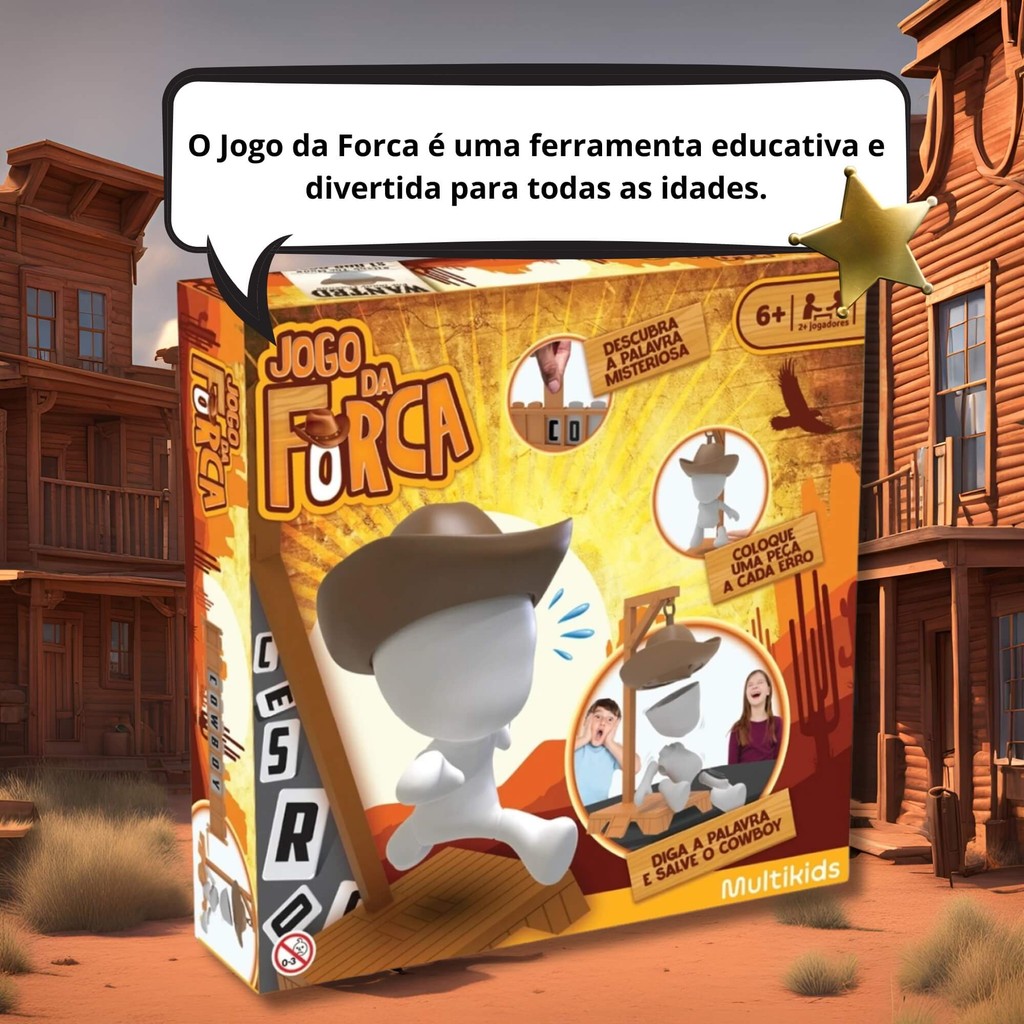 Prepare-se para embarcar em uma divertida e emocionante jornada de descobertas com o jogo da Forca! Desafie sua mente e seu vocabulário enquanto tenta desvendar a palavra secreta sem deixar nosso amiguinho o Cowboy, pode cair. Cada erro significa uma nova peça do seu quebra cabeça, então pense bem e escolha sabiamente suas letras! - Para 2 ou mais jogadores. - Idade Recomendada: +6 Anos Características: - Marca: MULTIKIDS - Modelo: BR2334 *Imagens Meramente Ilustrativas* Conteúdo da Embalagem: - Jogo da Forca Multikids - BR2334 jogo - jogos - jogos educativos - jogo da forca - multikids
