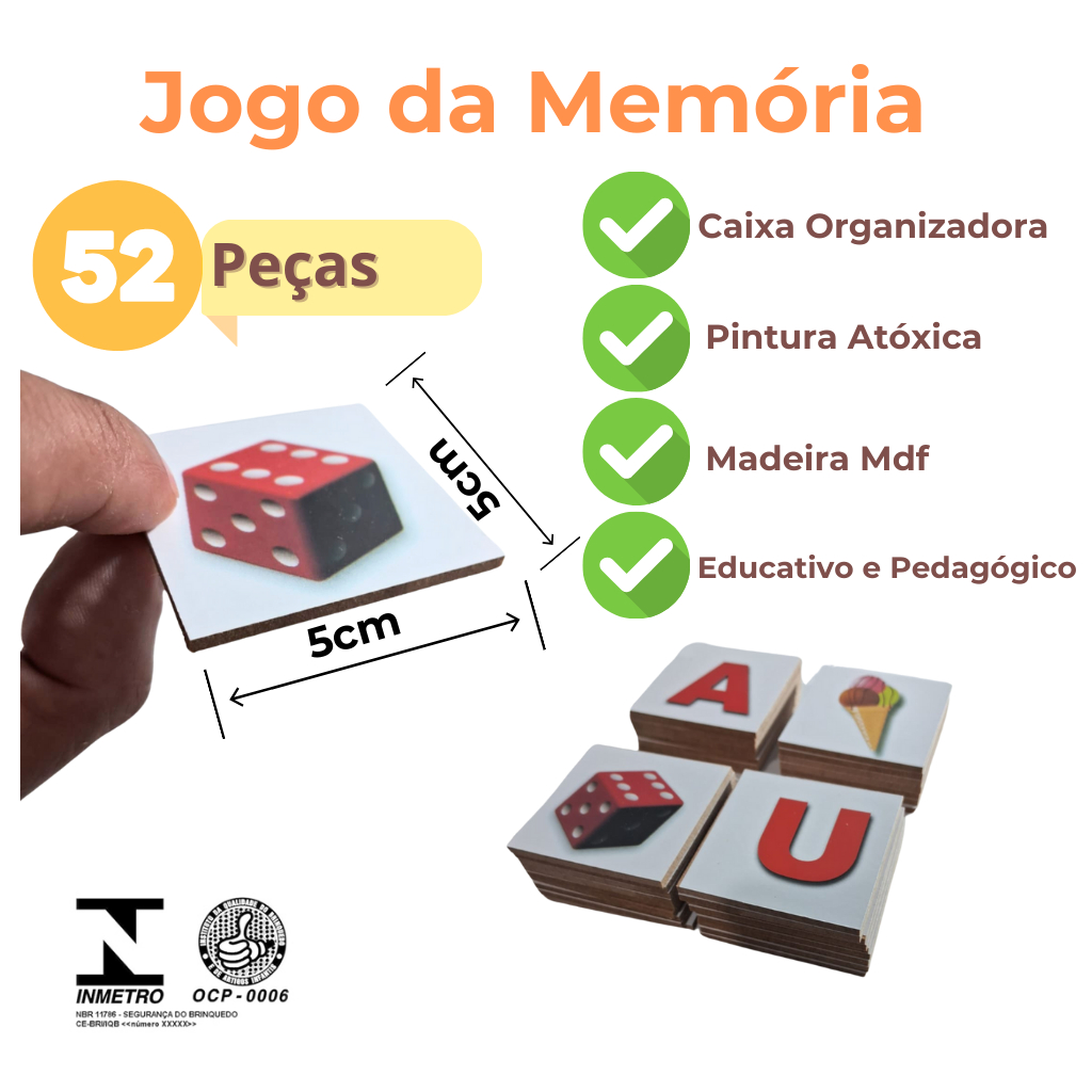 Jogo da Memória Alfabeto e Figuras - Desperte o Aprendizado! Descubra o prazer de aprender enquanto diverte-se com nosso Jogo da Memória Alfabeto e Figuras! Este jogo é mais do que apenas brincar; é uma ferramenta poderosa que estimula o raciocínio lógico, a memória e a atenção de forma lúdica e envolvente. Benefícios: Desenvolvimento Cognitivo: Estimule habilidades essenciais como memória e concentração. Aprendizado Divertido: Ideal para crianças, o jogo torna o aprendizado do alfabeto uma aventura emocionante! O que está incluído: 1 Caixa de MDF Organizadora: Com tampa que mantém todas as peças organizadas e seguras. 52 Peças de Madeira MDF: Inclui o alfabeto completo e figuras, permitindo diversas combinações e jogos. Detalhes do Produto: Dimensões da Caixa: 7 cm (altura) x 14 cm (comprimento) x 14 cm (largura). Tamanho das Peças: 5 cm x 5 cm e 3 mm de espessura, perfeitas para os pequenos. Regras do Jogo: Misture as cartas e coloque-as viradas para baixo na mesa. Os jogadores se revezam virando duas cartas, procurando um par com a letra e a figura correspondente. Par Correspondente: Se encontrar um par (ex: letra: L e Figura: Laranja), retire do jogo e ganhe um ponto. Se não, coloque as cartas de volta viradas para baixo. Vencedor: O jogo termina quando todas as cartas forem pareadas. O jogador com mais pares vence! Dica: Incentive as crianças a repetir o som da letra e o nome da figura. Transforme a maneira como as crianças aprendem com nosso Jogo da Memória Alfabeto e Figuras. Ideal para família, escolas ou como um presente especial!
