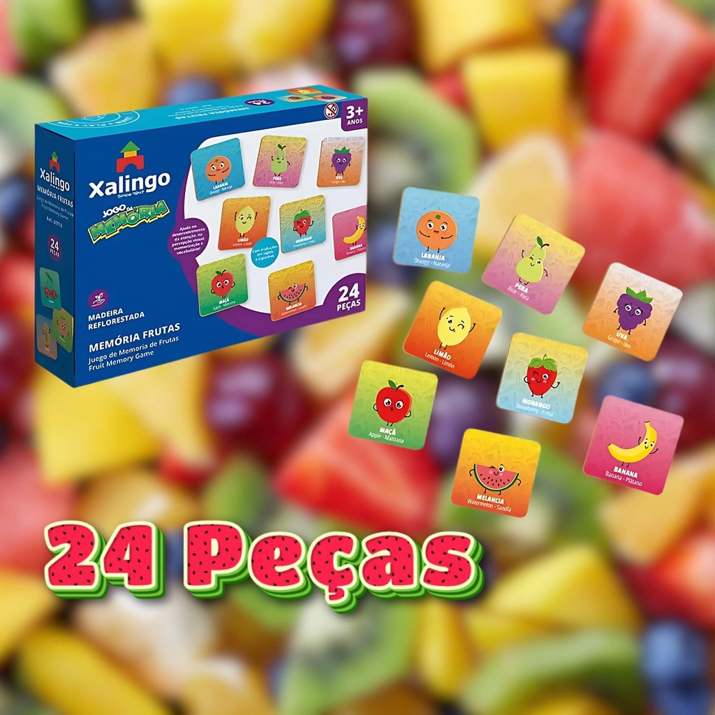 Jogo da Memória Frutas Infantil A partir de 3 Anos 24 Peças Madeira Brinquedo Educativo Xalingo - 50776