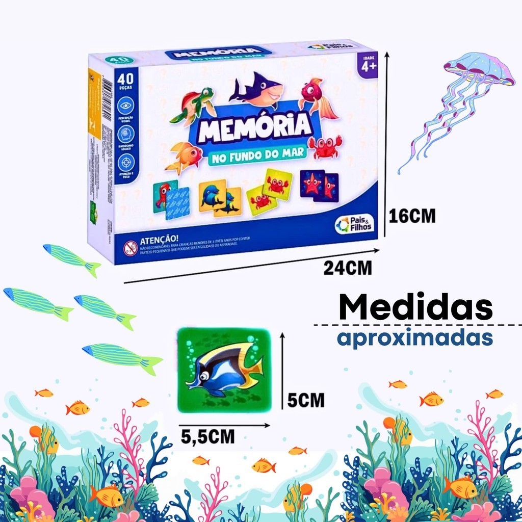 Jogo da memória no fundo do mar da Pais & Filhos estimula a memória dos participantes, que por sua vez, tentam encontrar figuras idênticas, formando o par, ganha aquele que conseguir o maior número de pares e de figuras. ESPECIFICAÇÕES DO PRODUTO: - Recomendado para maiores de 4 anos. - Contém 20 pares de cartas. - Dimensões Aproximadas do pacote: 23 x 21.6 x 4.8 centímetros Características: - Marca: Pais e Filhos - Modelo: 7362-1 *Imagens Meramente Ilustrativas* Conteúdo da Embalagem: - 40 Cartas (20 pares) de Jogo da Memória (Fundo do Mar) jogo da memoria - jogo da memoria fundo do mar - jogos da memoria - jogo da memoria infantil - jogo da memória mar - jogo da memoria pra criança