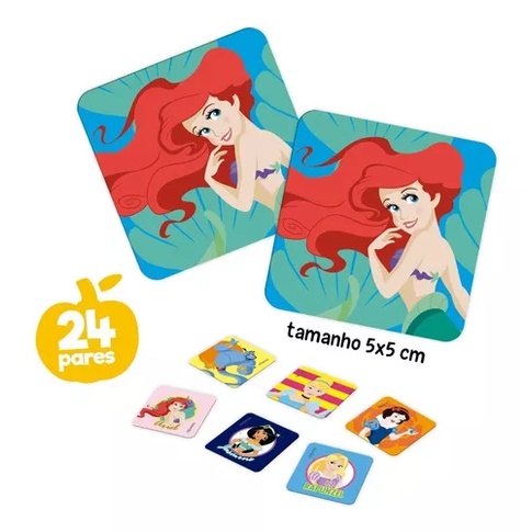 Jogo da Memória Princesas Disney Entre nessa diversão com seus personagens Princesas Disney. É diversão garantida para toda a família brincar junto, Jogo da Memória composto 24 pares dos seus personagens favoritos. É um jogo infantil com personagens que estimula o raciocínio lógico, a atenção, a organização e a concentração das crianças. BENEFICIOS: Estimula a Interação Entre Pais e Filhos, desenvolve a distinção de formas e cores, a comunicação, a coordenação motora, a interação social e cultural...brincando desenvolve-se a criança num todo! Informações: Idade Mínima Recomendada Pelo Fabricante:+4 anos Dimensões Aproximadas da embalagem (AxLxC): 20cmx4cmx14cm Dimensões Aproximadas da peça (AxC): 5cmx5cm Número de peças: 24 peças Números de participantes: 1 ou mais jogadores Material: Papel e Papel Cartão Cor: colorido INMETRO REGISTRO: CE-BRI/IQB-002320 NM 300/2002 Fabricante: Toyster Conteúdo da Embalagem: 24 Peças
