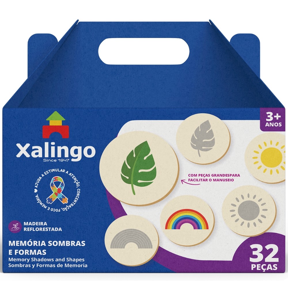 JOGO DA MEMÓRIA SOMBRAS E FORMAS II 32 PEÇAS XALINGO MADEIRA REFLORESTADA CONCENTRAÇÃO FOCO MEMÓRIA
