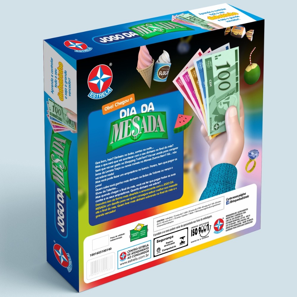 ***PRODUTO ESTRELA EM PORTUGUÊS ORIGINAL, OFICIAL, LACRADO E COM NOTA FISCAL*** JOGO DA MESADA ESTRELA BRINQUEDO TABULEIRO DINHEIRO DIVERSÃO FAMÍLIA CRIANÇAS NOTAS EMPREENDIMENTOS Informações Técnicas: - Contém: 1 tabuleiro, 15 notas de $100,00, 20 notas de $50,00, 40 notas de $10,00, 20 notas de $5,00, 45 notas de $1,00, 72 cartas, 6 peões, 1 dado, 1 bloco para registro de empréstimos, e 1 manual de instruções. - EAN: 7896027559422 - Produto certificado REGISTRO: 001 818/2020 - Peso 500g - JOGO - Idade: 6+ ANOS - 2 a 6 jogadores - Marca: ESTRELA - Garantia: Contra defeitos de fabricação - Prazo de Validade: Indeterminado Obs: O produto e as cores podem variar do apresentado nas fotos da embalagem. Imagens meramente ilustrativas! ATENÇÃO! NÃO RECOMENDÁVEL PARA CRIANÇAS MENORES DE 3 (TRÊS) ANOS POR PODER GERAR PARTE(S) PEQUENA(S) QUE PODE(M) SER ENGOLIDA(S) OU ASPIRADA(S). Neste divertido jogo, as crianças têm que aprender a lidar com seu dinheiro, combinando seus gastos e empréstimos com o recebimento da mesada. Vence quem chegar no final do mês (representado pelo tabuleiro) com mais dinheiro! Que bom, hein? Dinheiro no bolso, sorriso no rosto... Mas o que será que vai acontecer com o seu dinheiro no final do mês? Será que vai ser gasto no Shopping Tudo Tem? Vai ser usado para comprar livros da Livraria Traça ou novos móveis na Móveis Durma Bem? Xiii... não vai sobrar nada! Mas você pode fazer um empréstimo no banco. Porém, tem que pagar os juros! Quem sabe você ganha mais dinheiro na Bolsa de Valores ou vença o Show de Talentos... Mas quando chegar o final do mês, você vai ter que pagar todas as suas contas e os seus empréstimos. Quanto dinheiro vai sobrar? Descubra isso da forma mais divertida e emocionante com o JOGO DA MESADA: um desafio para ver quem consegue esticar melhor sua mesada até o final do mês. Quem tiver mais dinheiro sobrando no final do mês é o grande vencedor! --------------------------------------------------- SEJA MUITO BEM VINDO(A) A LOJA DE BRINQUEDOS DO CANAL 40 POR QUÊ COMPRAR NA LOJA DE BRINQUEDOS DO CANAL 40? *Enviamos seu pedido sempre no mesmo dia ou no máximo no próximo dia útil dependendo do horário da sua compra! *Produtos lacrados, originais e oficiais da mais alta qualidade; *Experiência única de compra (incluindo a experiência olfativa - você sentirá nosso cheiro); *Todos os nossos produtos estão à pronta entrega em nosso estoque físico aqui no Brasil; *Seu pedido será enviado com segurança e agilidade; IMPORTANTE: Tenha tranquilidade de comprar com quem está disposto a te oferecer o melhor atendimento, caso tenha algum problema após a compra, conte com nossa equipe de pós venda para solucioná-lo! A LOJA DE BRINQUEDOS DO CANAL 40 tem a missão de garantir a satisfação total do seu cliente, tanto nos produtos quanto no atendimento. Assim estabelecemos uma relação única de confiança! Não encontrou o que procurava? Clique na foto da nossa logo para entrar em nossa loja e ver todos os nossos produtos OU nos mande uma mensagem diretamente aqui pelo chat. SERÁ UM PRAZER ATENDÊ-LO(A)! --------------------------------------------------- MUITO PRAZER, ME CHAMO FELIPE CAMARGO, SOU DONO, CEO E CRIADOR DE CONTEÚDO DO CANAL 40. DESDE JÁ, DEIXO AQUI O MEU MUITO OBRIGADO!!! CANAL 40 - LOJA DE BRINQUEDOS LTDA DEIXE SUA CRIANÇA INTERIOR FELIZ E APROVEITE!