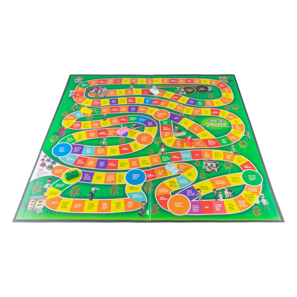 De médico a artista, você deve estar preparado para momentos de sorte e azar. Trilhe o seu caminho em busca do sucesso! Desenvolva a sua carreira, ganhe dinheiro, case e tenha filhos. O Jogo da Vida é a simulação da vida real com muita diversão! Peças: - 1 Tabuleiro - 6 Carrinhos - 32 Pinos Azuis - 32 Pinos Rosas - 24 Cartões de Riqueza - 24 Apólices de Seguro - 360 Notas - 8 Certificados de Ações - 21 Notas Promissórias - 1 Roleta - 1 Manual de Instruções
