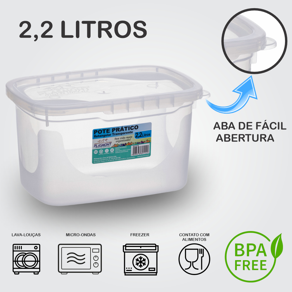 jogo de 10 Potes retangular Práticos de 2,200ml, plástico reforçado