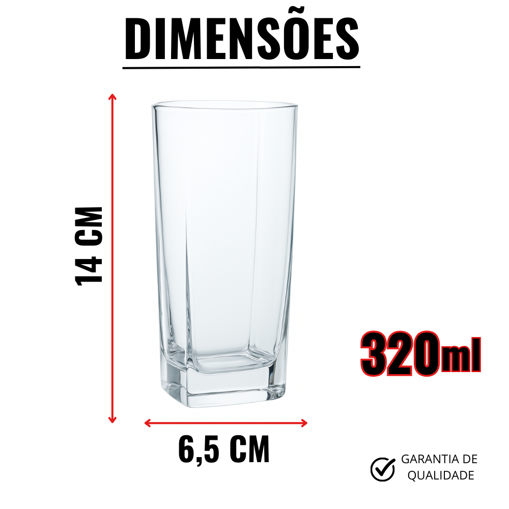 Jogo De 12, 6 e 4 Copos Vidro Texas REFORÇADO Quadrado Luxo Transparente 320ml