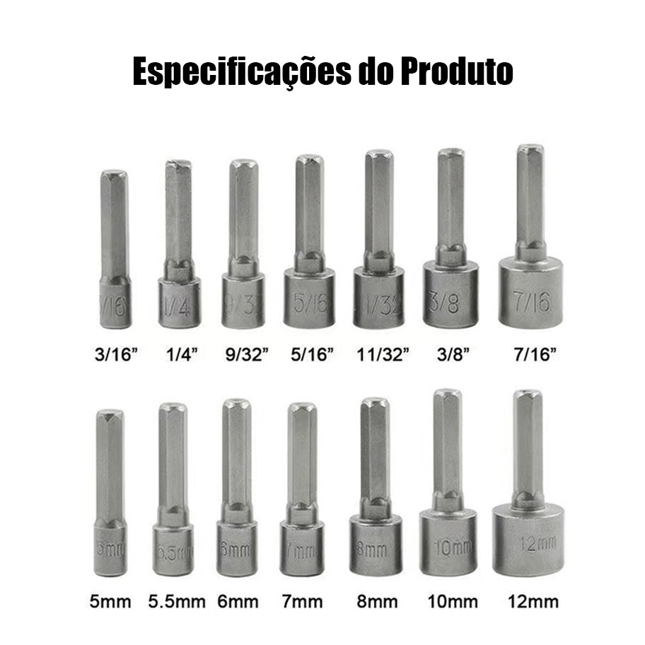 Jogo de 14 Peças: Soquetes Canhão de 4 a 13mm + Adaptadores Hexagonais