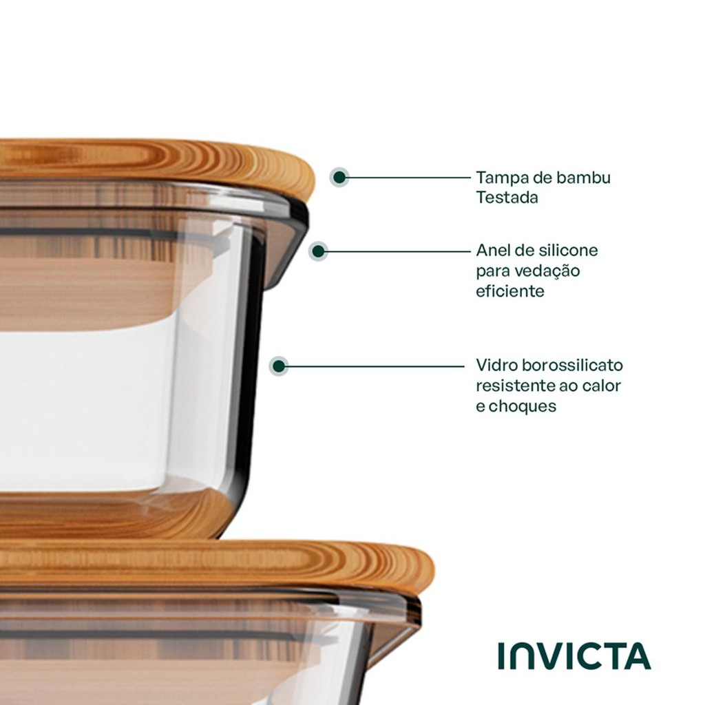 Jogo de 4 Potes de Vidro Conserve It Bamboo – Invicta: frescor, praticidade e estilo para sua cozinha O Jogo de 4 Potes de Vidro Conserve It Bamboo da Invicta oferece o equilíbrio perfeito entre design sofisticado, funcionalidade e durabilidade. Com tampas de bambu natural, o conjunto agrega um toque acolhedor à cozinha, além de possuir agente orgânico com ação bactericida e baixa absorção de umidade, ajudando a evitar a proliferação de fungos e mofo. Versáteis e resistentes, os potes suportam uso no micro-ondas, lava-louças, forno (até 300°C) e freezer (até -5°C). O anel de silicone removível garante vedação eficiente, preservando o frescor, aroma e sabor dos alimentos por muito mais tempo. Além disso, seu design inteligente economiza espaço e possibilita levar os recipientes da mesa à geladeira ou do forno diretamente à mesa. Perfeitos para armazenar desde alimentos secos, panificados e temperos até frios, líquidos e sobras de refeições. A tampa, além de vedar com eficiência, pode ser utilizada como proteção térmica ao servir. É a escolha ideal para quem busca qualidade, estilo e praticidade no dia a dia, com a confiança da marca Invicta. Especificações Marca: Invicta Modelo: Conserve It Bamboo Material: Vidro Borossilicato Material da Tampa: Bamboo, Anel de Silicone Podem ser levados em: Lava-Louças, Micro-ondas, Forno até 300°C, Freezer até -5°C (exceto tampa) BPA Free, vedação com anel de silicone removível, tampa com ação bactericida Dimensões da embalagem (AxLxC): 15,5 x 23,5 x 18,2 cm Observações: Não levar a Tampa de Bambu ao forno, micro-ondas ou lava-louças. Não indicado para transporte de líquidos em bolsas/mochilas. Dimensões: 300ml: Medidas (AxLxC): 5,5 x 11 x 15cm Peso:400g 500ml: Medidas (AxLxC): 5,8 x 13,1 x 17,6cm Peso:570g 900ml: Medidas (AxLxC): 6,6 x 15,1 x 19,9cm Peso:830g 1260ml: Medidas (AxLxC): 7,2 x 16,8 x 22,4cm Peso:1,1kg