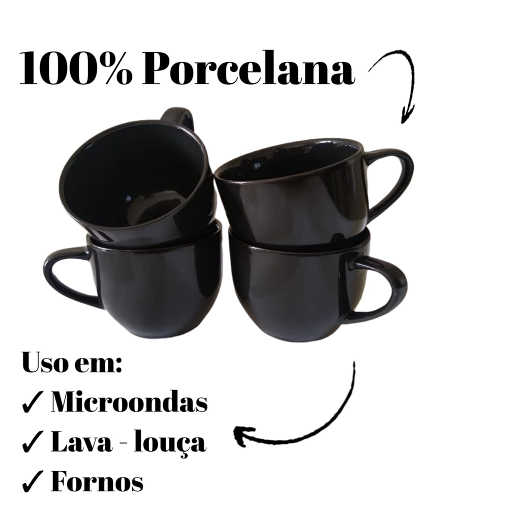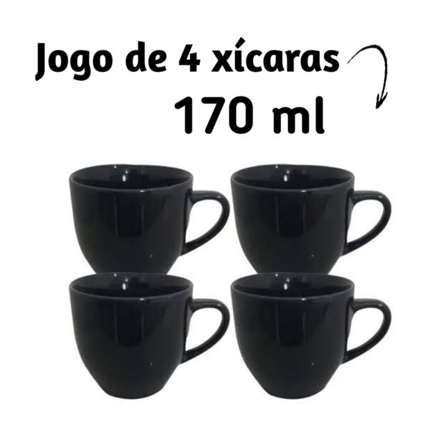 Jogo de 4 Xícaras de Café Chá Porcelana 170ml Preto Preta - Cantinho do Café