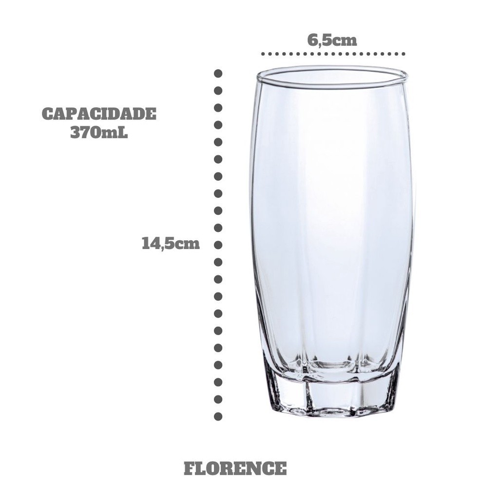 | Jogo De 6 Copos Vidro 370ml Florence Luxo Transparente este produto | R$ 44,90 | — | 4.8/5 | 25 |