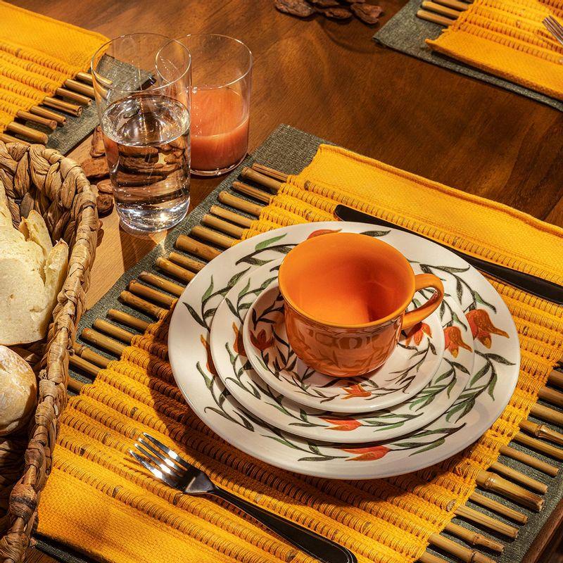 Os lírios são uma das flores mais comuns em jardins e casas brasileiras. Na coleção Donna Lírios, ele vira a estrela principal da decoração. As bordas de cada borda e pires recebem o desenho feito à mão da flor de cor laranja junto de ramos e folhas. As cores são vibrantes e trazem alegria à mesa. A xícara é esmaltada em laranja. O conjunto acompanha 6 sobremesas rasos. Conteúdo da embalagem: 6 Pratos de sobremesa com 18cm de diâmetro - Garantia: 3 Meses para Defeitos de fabricação - Marca: Biona - Tipo da embalagem: Papelão pardo - Uso: Resistente a micro-ondas - Cor: Laranja - Decoração: Estampado - Formato: Redondo - Material: Cerâmica - Formato de venda: Kit - Quantidade de peças: 6 - Diâmetro: 18cm ATENÇÃO: Para compras de pessoa jurídica,cadastreosdados exatamente como consta em seu cartão do CNPJ.