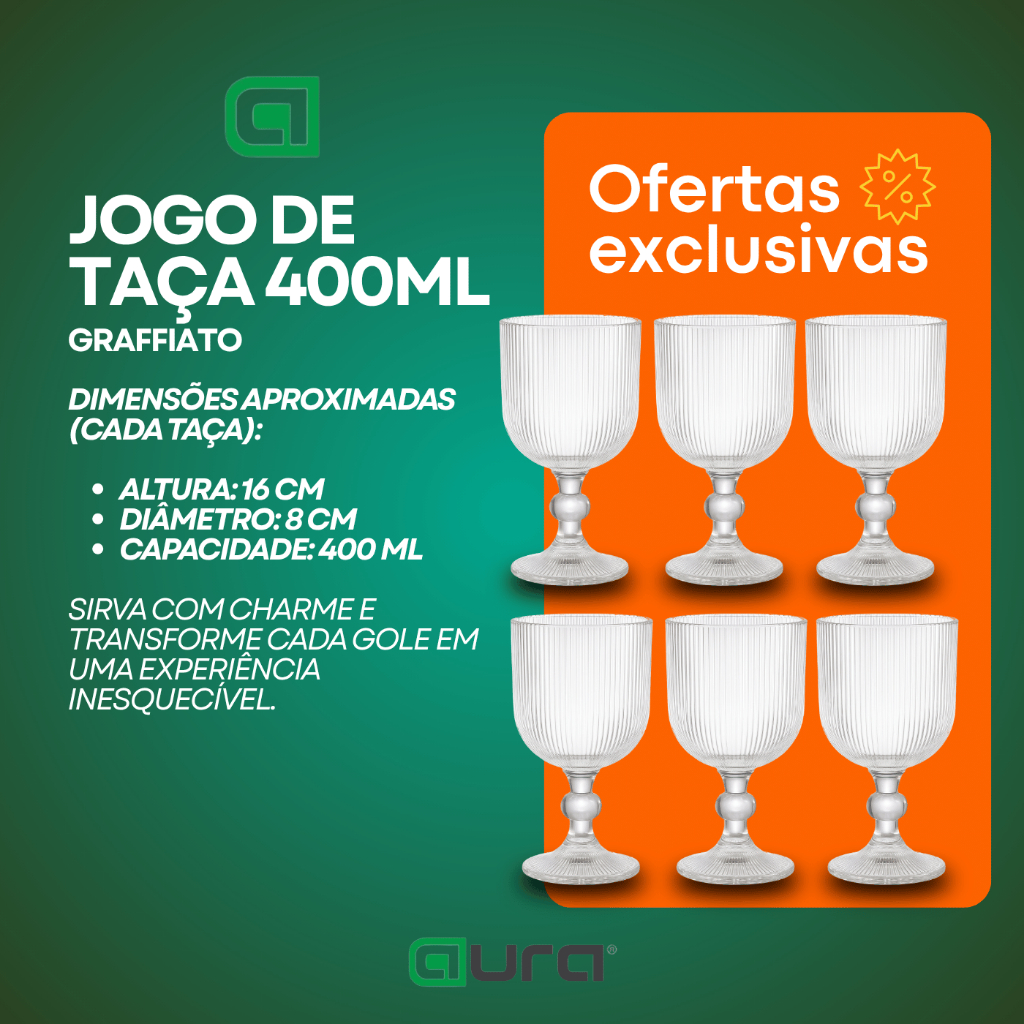 Jogo de Taças Graffiato – 400 ml (6 unidades) Elegância, sofisticação e versatilidade para suas bebidas favoritas! O Jogo de Taças Graffiato é ideal para quem valoriza bom gosto na hora de servir. Com design texturizado em vidro transparente de alta qualidade, essas taças unem beleza e funcionalidade, perfeitas para coquetéis, drinks, sucos ou até água com muito estilo. Destaques do Produto: Design sofisticado e moderno: Textura graffiato que impressiona na decoração da mesa Capacidade generosa – 400 ml: Ideal para diferentes tipos de bebidas Vidro resistente e elegante: Qualidade e durabilidade para uso diário ou ocasiões especiais Toque de luxo para sua casa: Ideal para jantares, festas, encontros e momentos especiais Ótima opção de presente: Perfeito para surpreender com estilo Dimensões aproximadas (cada taça): Altura: 16 cm Diâmetro: 8 cm Capacidade: 400 ml Sirva com charme e transforme cada gole em uma experiência inesquecível.